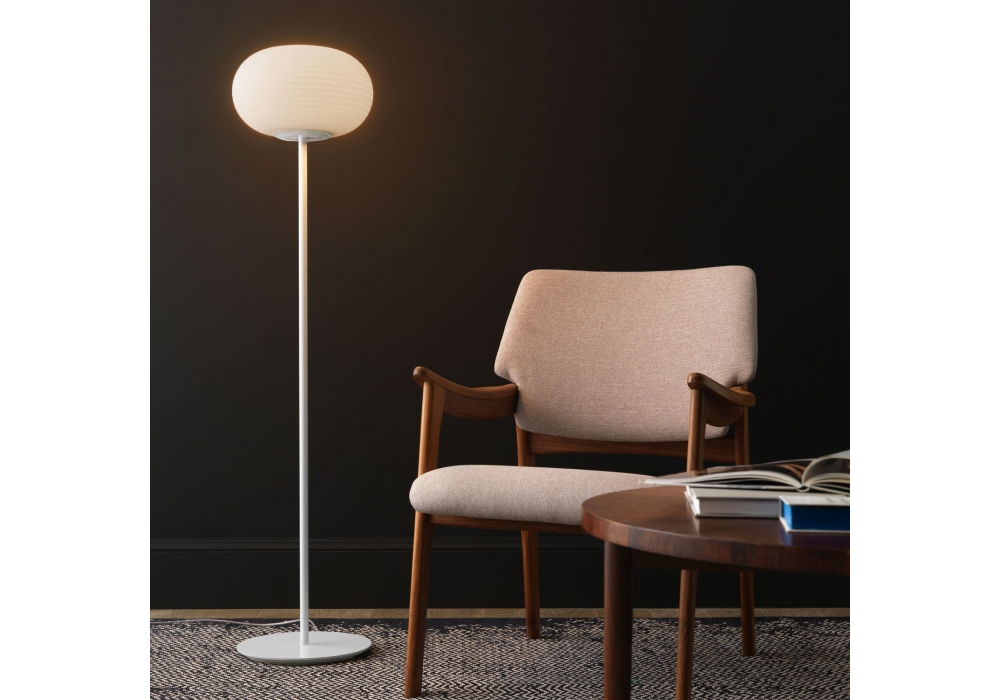 Bianca diseñada por Matti Klenell para Fontana Arte es una lámpara de pie regulable de luz difusa con interruptor deslizante. Difusor de vidrio laminado en color blanco lechoso, todavía soplado y acabado satinado. Estructura en metal pintado. Cable de alimentación transparente, enchufe y dimmer.