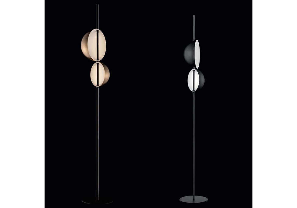 Superluna diseñada por Victor Vasilev para Oluce es una lámpara de pie con base circular y barra vertical en metal pintado. Los difusores son dos semiesferas orientables de metal pintado y protegen una fuente de luz LED regulable. Superluna está disponible en diferentes acabados.
