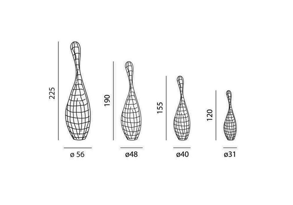 | Dimensiones | Bolla S_ Ø 31 x H 120 cm; Bolla M_ Ø 40 x H 155 cm; Bolla L_ Ø 48 x H 190 cm; Bolla XL_ Ø 56 x H 225 cm; |
