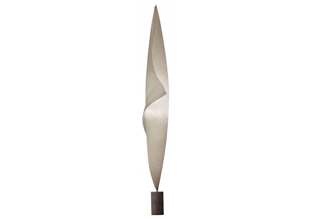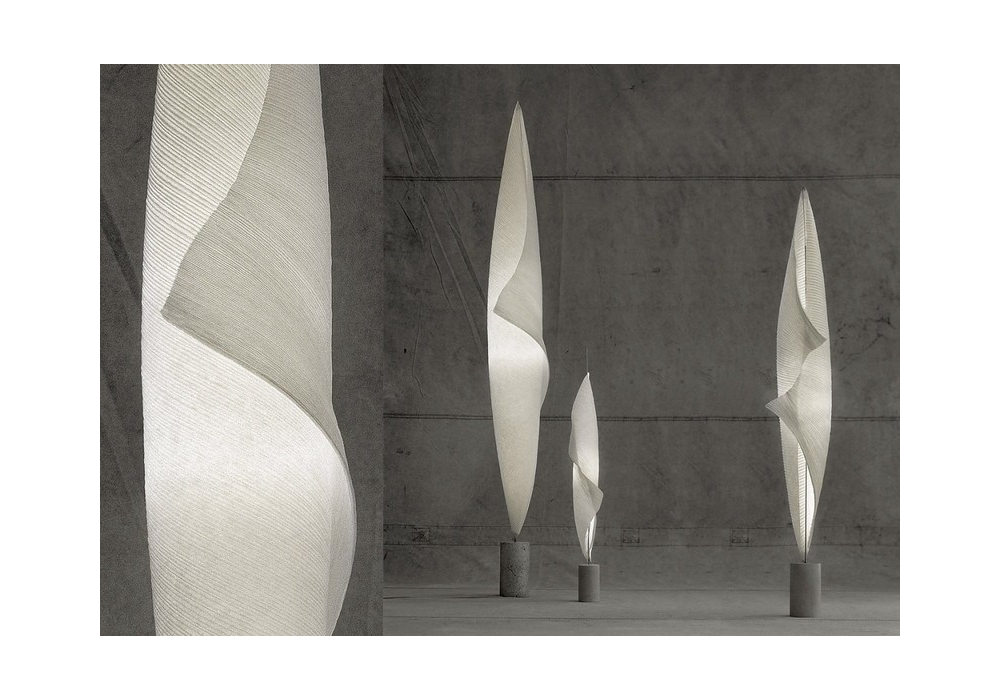 Wo-Tum-Bu 1 diseñada por Dagmar Mombach para Ingo Maurer es una lámpara de pie en papel, hormigón, metal, acero inoxidable y pantalla de fibra de vidrio. Con dimmer electrónico de regulación continua. No apto para uso en ambientes de alta humedad.