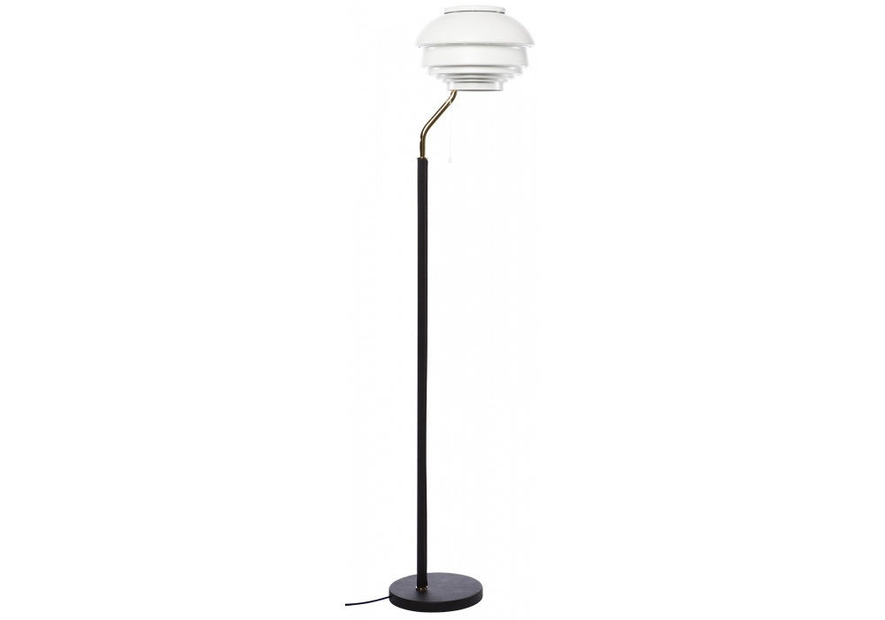 The A808 Floor Lamp designed by Alvar Aalto for Artek. Shade polished brass or white painted steel. Base and stand covered with black leather. Upper part of the stand polished brass.