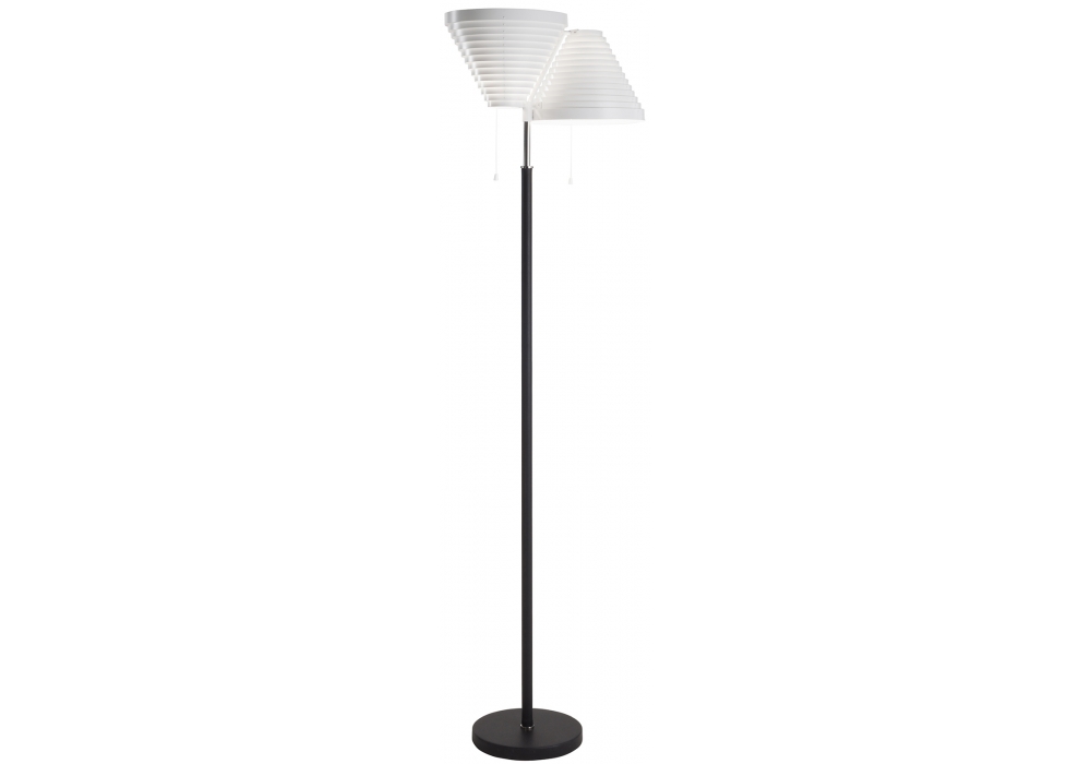 The A810 Floor Lamp is designed by Alvat Aalto for Artek. Hand-riveted, louvered steel shade painted white. Base and stand covered with black leather, black plastic cable 250 cm, upper part polished brass, upper part stainless steel.