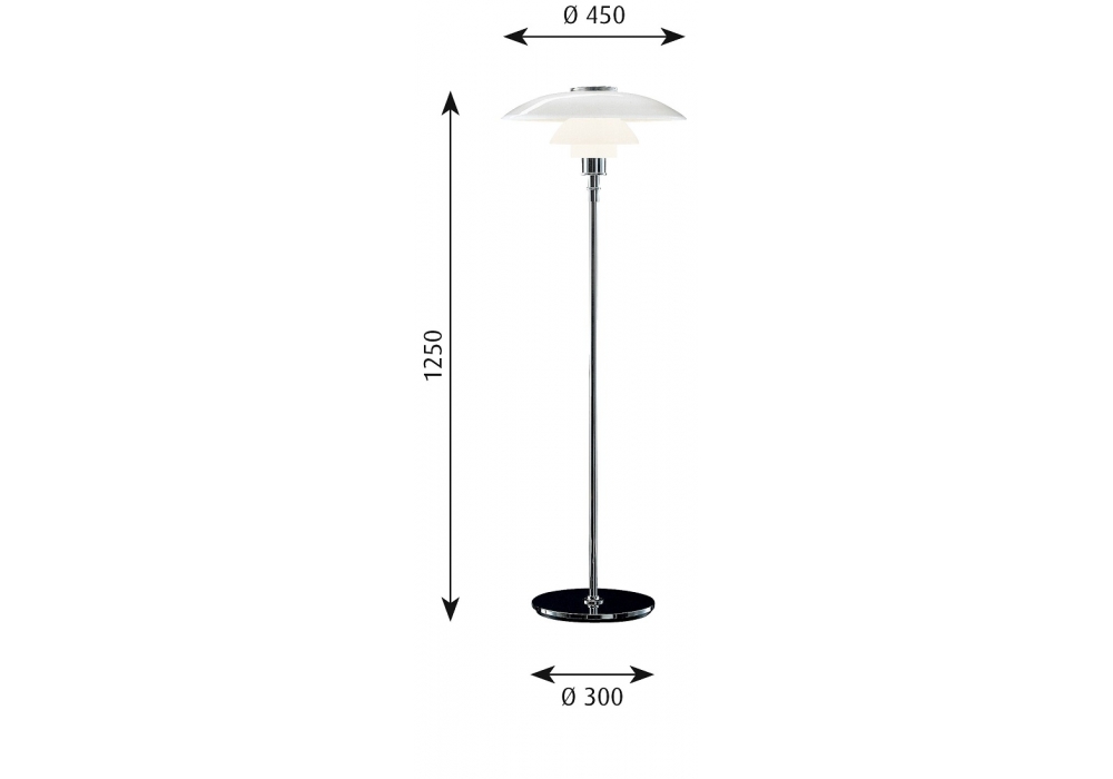 PH 4½-3½ Glass diseñada por Poul Henningsen para Louis Poulsen es una lámpara de pie con base circular en latón hilado y varilla de acero tubular, ambos cromados. Los difusores son de cristal opal blanco y apantallan una fuente de luz LED o halógena con casquillo E27.