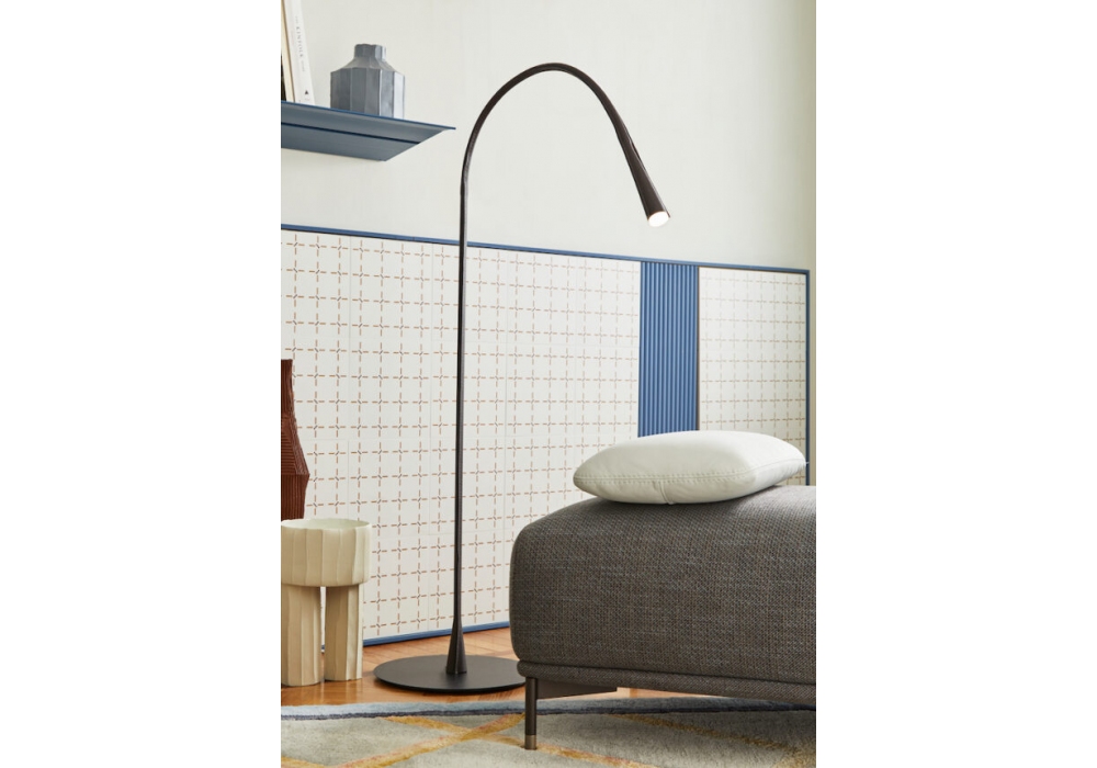 Flexiled diseñada por King & Roselli para Contardi es una lámpara de pie con base circular en níquel satinado o bronce cepillado y brazo flexible en malla de acero tejido. El cabezal está revestido de cuero y adopta una fuente de luz LED con un sistema de regulación del pedal en el cable de alimentación. Flexiled está disponible en diferentes acabados de piel.