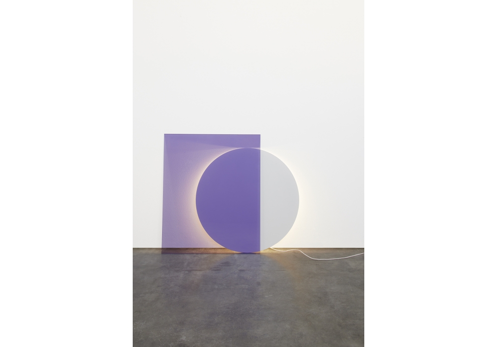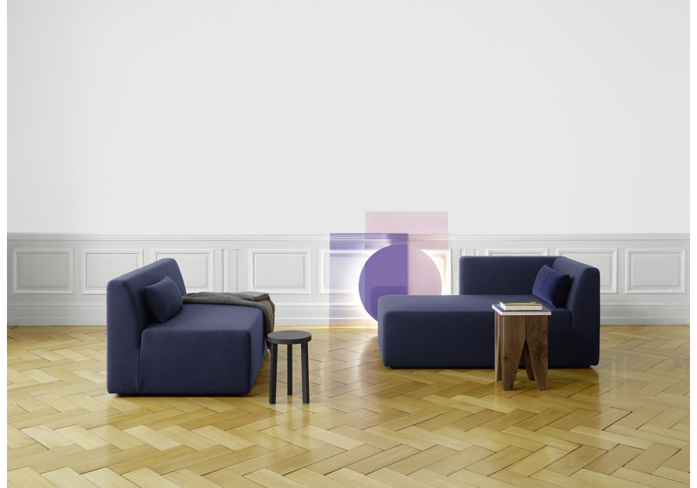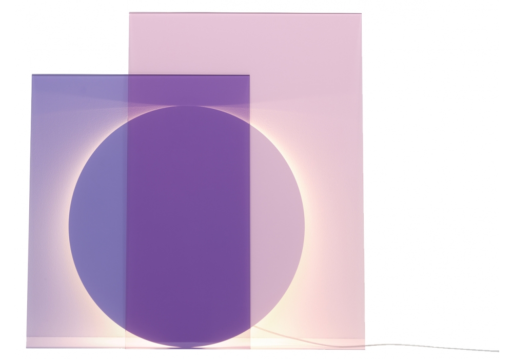 LT04 Color diseñada por Daniel Rybakken y Andreas Engesvik para E15 es una lámpara de pie compuesta por dos placas de vidrio rosa y azul y un difusor circular en acero pintado en polvo blanco.
