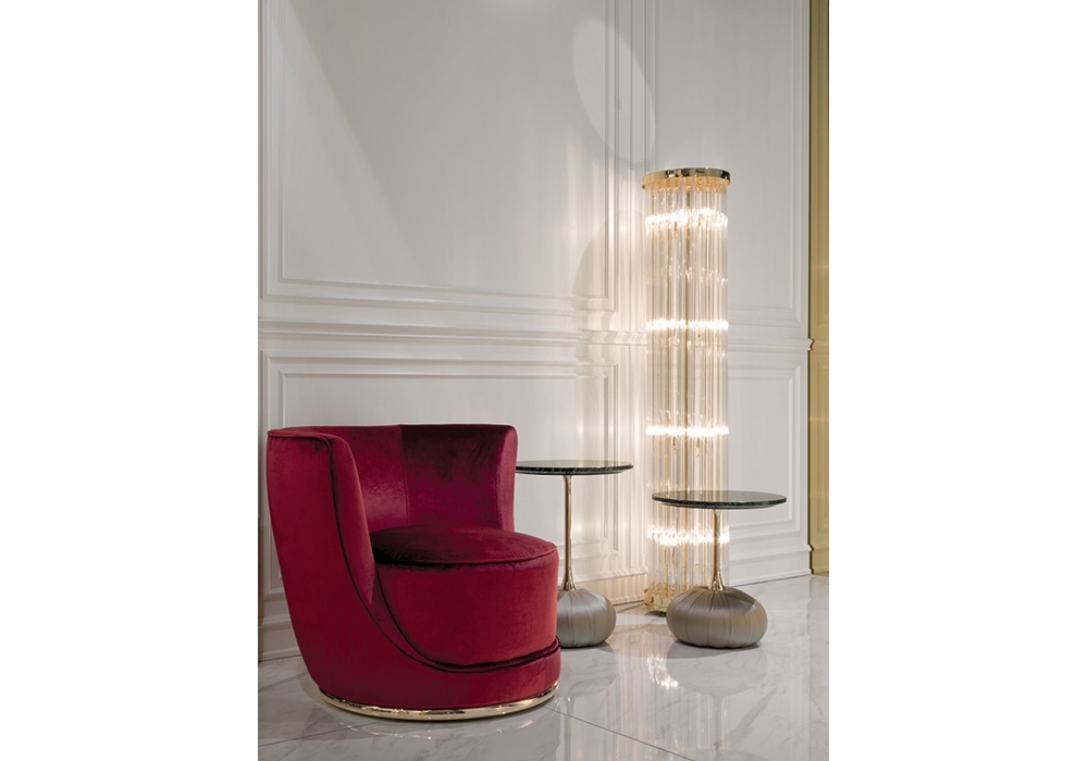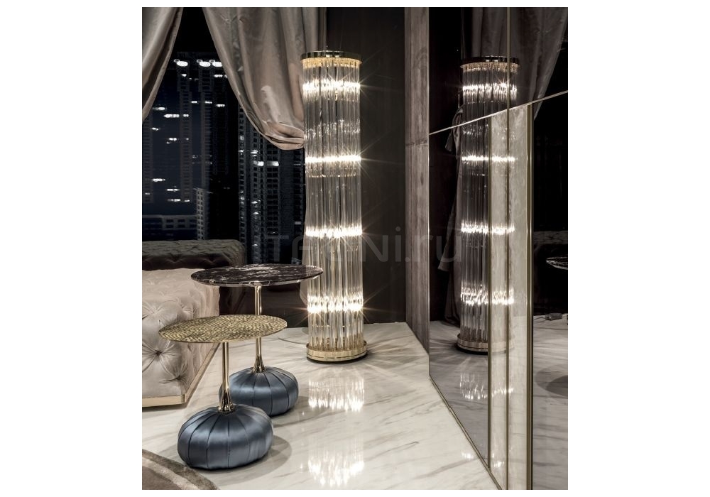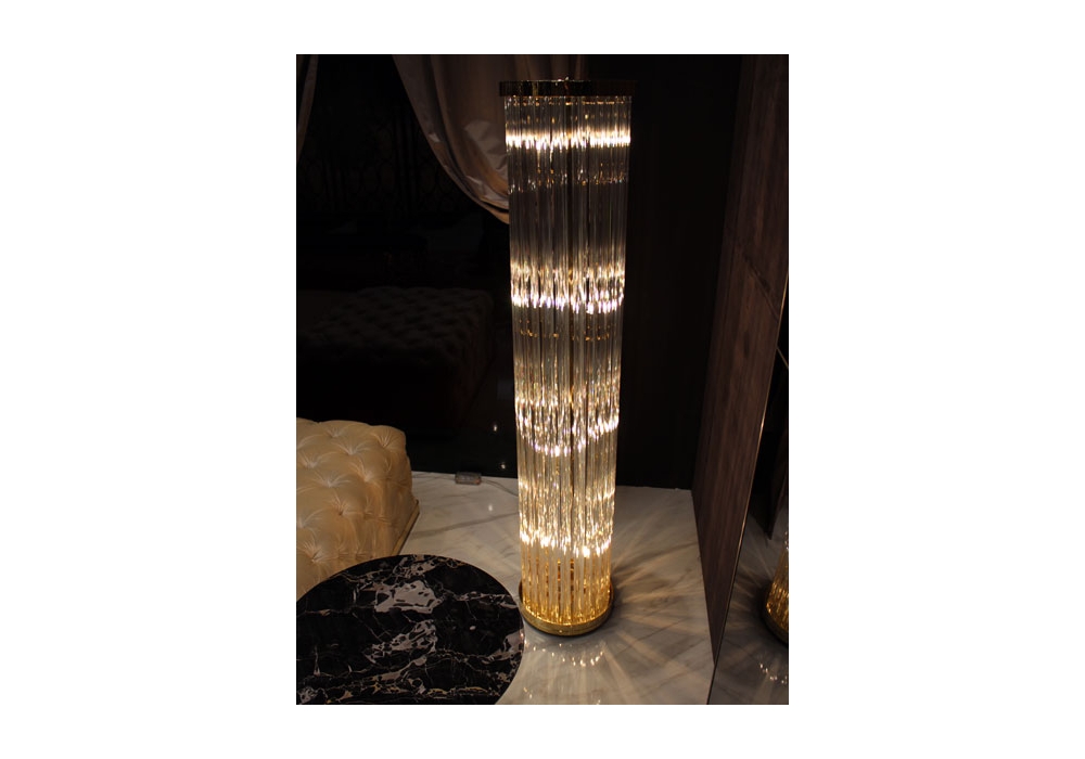 Elisabeth diseñada por Giuseppe Iasparra para Longhi es una lámpara de pie con estructura de metal y lamas de cristal de Murano. Disponible en diferentes acabados.