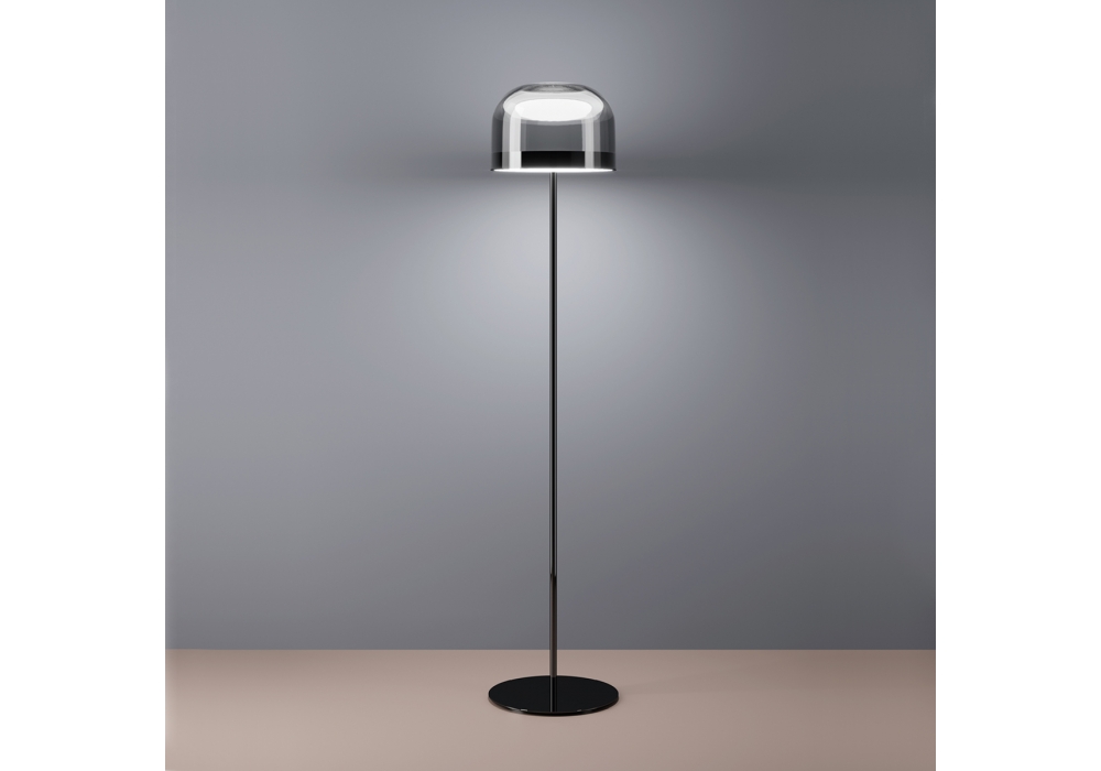 Equatore diseñada por Gabriele & Oscar Buratti para Fontana Arte es una lámpara de pie con luz difusa regulable producida por LED insertados dentro de dos discos de policarbonato superpuestos. El disco inferior produce una emisión de luz hacia abajo, el superior ilumina la tapa de vidrio. Estructura en metal galvanizado o pintado. Difusor en cristal transparente. Cable de alimentación, atenuador y enchufe negros. Disponible en diferentes medidas y acabados.