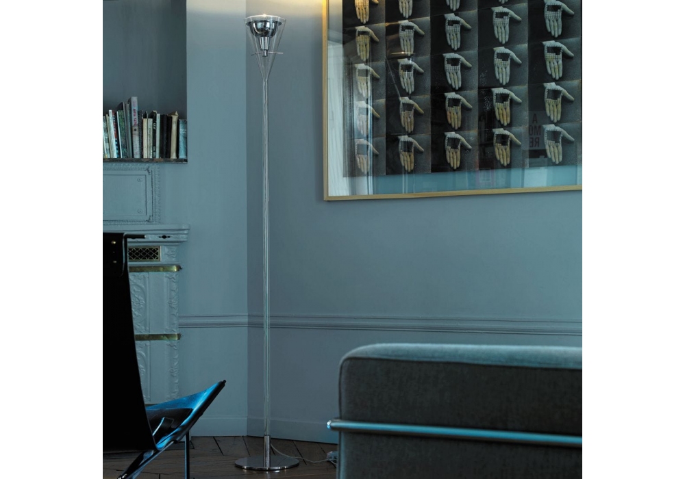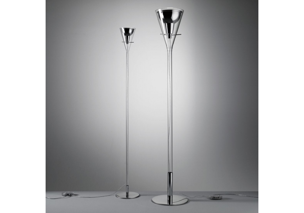 Flute diseñada por Franco Raggi para Fontana Arte es una lámpara de pie regulable de luz indirecta con cursor deslizante. Vástago en vidrio borosilicato transparente con reflector en aluminio cromado brillante y base y soporte del reflector en metal cromado. Cable de alimentación transparente, dimmer y enchufe. Disponible en diferentes dimensiones.