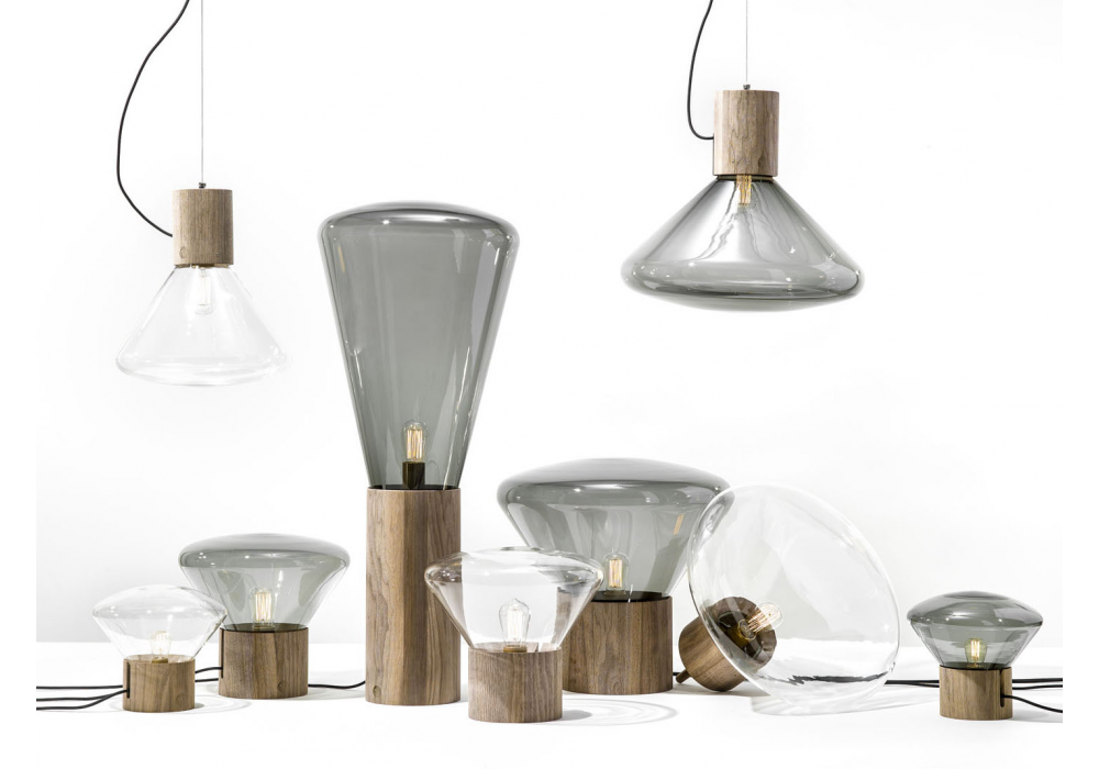 Muffins Wood 04 diseñada por diseñada por Dan Yeffet y Lucie Koldová para Brokis es una lámpara de pie con difusor de vidrio pantalla en diferentes colores. La base es de forma cilíndrica en diferentes acabados de madera tratada o natural. La fuente de luz adoptada es del tipo LED.