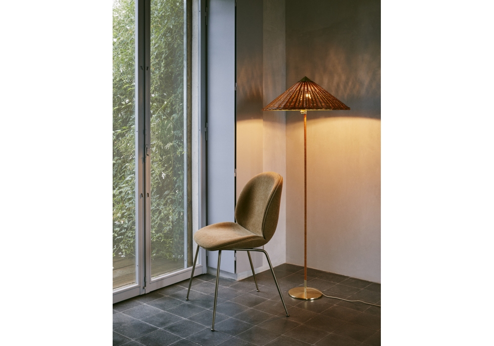 9602 diseñada por Paavo Tynell para Gubi es una lámpara de pie con pantalla en tejido Canvas, Wicker Willow o Bamboo (sin tratar). Bombilla no incluida.