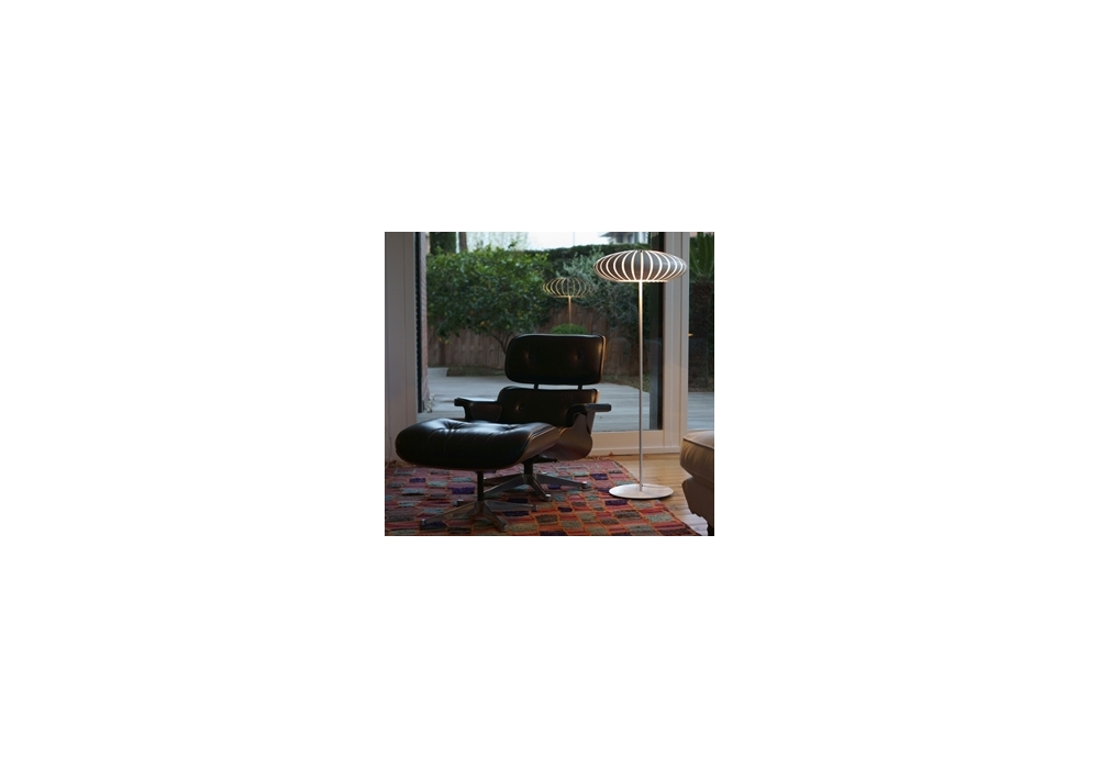 Maranga P130 diseñada por Christophe Mathieu para Marset es una lámpara de pie realizada en policarbonato y metal cromado.