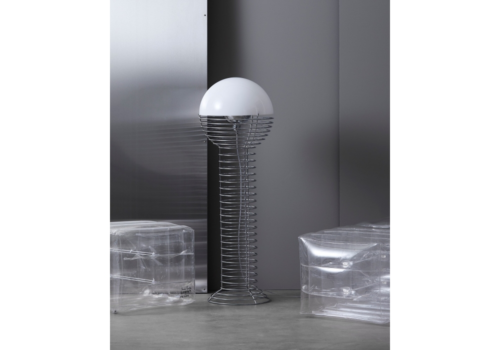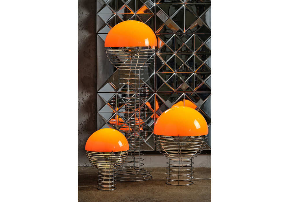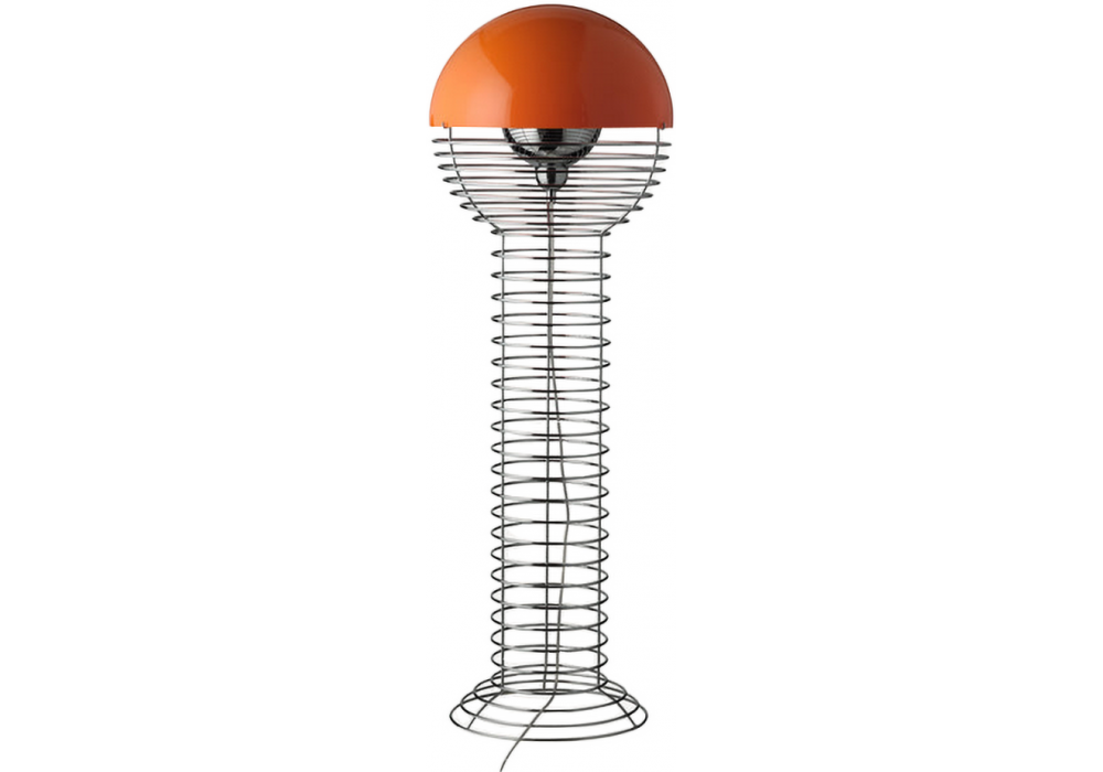 Wire diseñada por Verner Panton para Verpan es una lámpara de pie con estructura metálica cilíndrica que se expande en la parte superior formando una semiesfera. Difusor de plástico blanco o naranja.