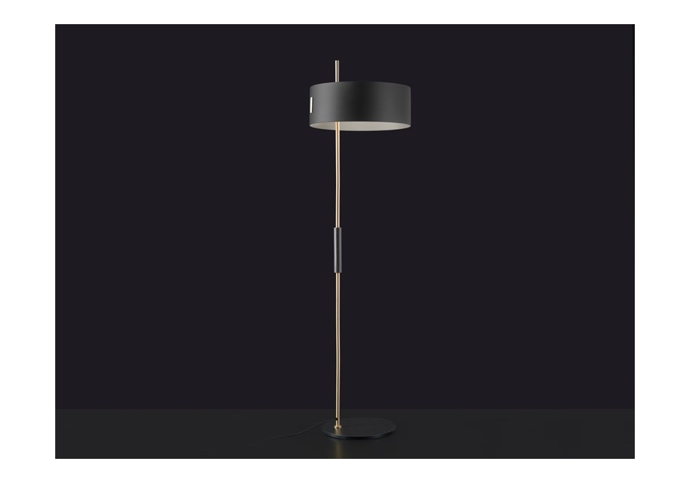 1953 diseñada por Ostuni & Forti para Oluce es una lámpara de pie realizada íntegramente en metal con base circular pintada en negro mate y varilla vertical en color oro satinado. La pantalla es de metal negro mate con tapa dorada satinada y protege una fuente de luz.
