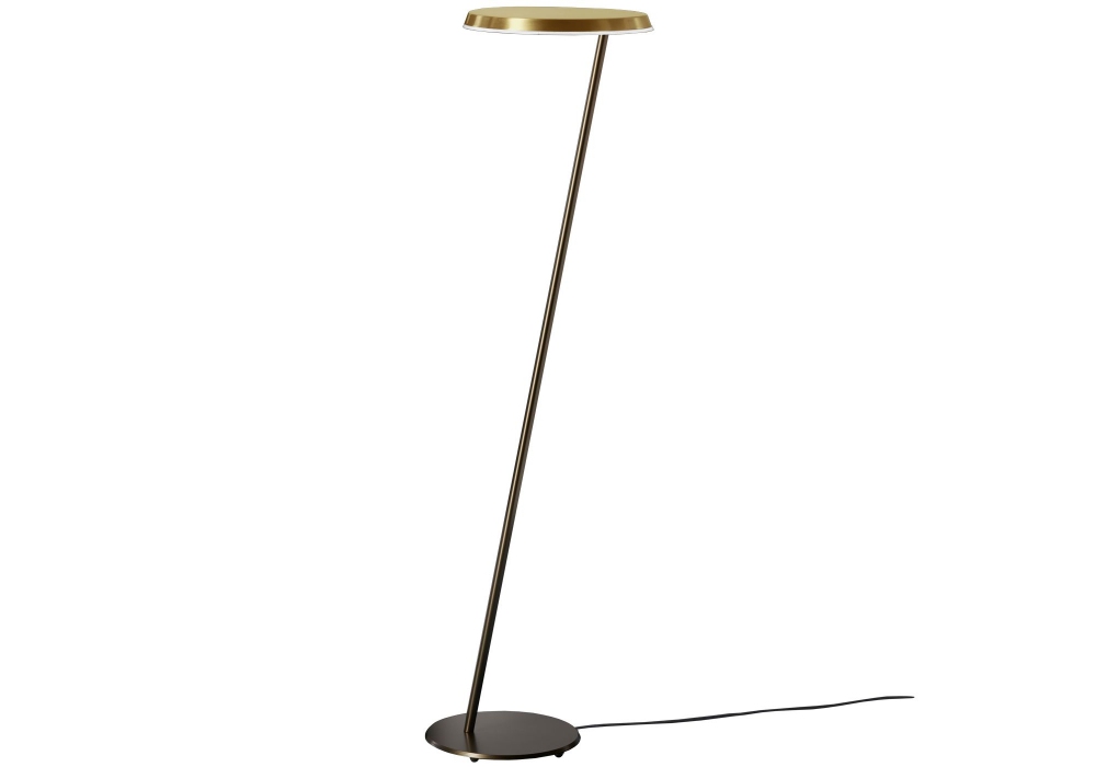 Amanita diseñada por Mariana Pellegrino Soto para Oluce es una lámpara de pie con base circular y varilla tubular en metal pintado bronce. El cabezal es de metal pintado oro satinado con difusor de PMMA y adopta una fuente de luz LED regulable.