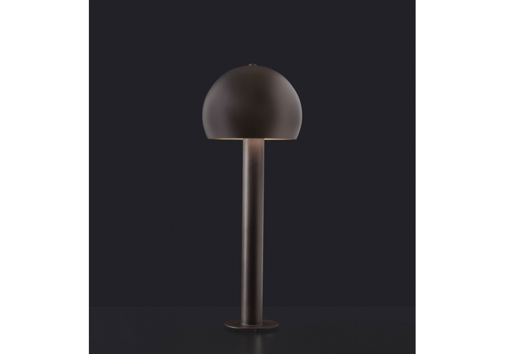 Otto diseñada por Federica Farina para Oluce es una lámpara de pie para exterior con base circular y tija cilíndrica en metal marrón indio. El difusor orientable tiene forma hemisférica y adopta una fuente de luz tipo LED.