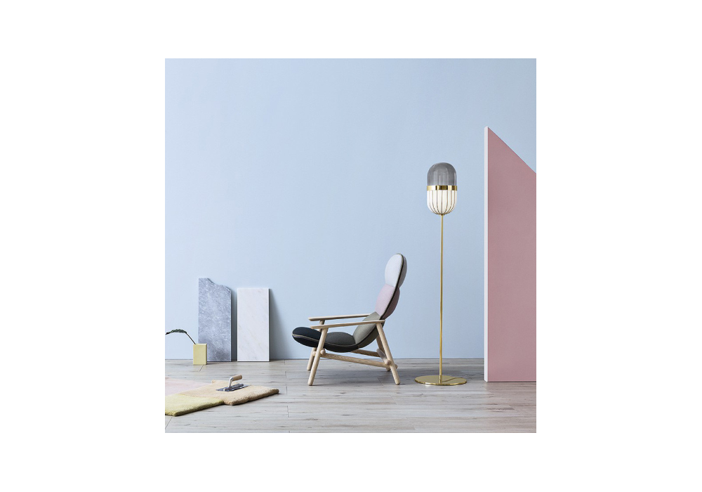 Pill 7237/LT1 diseñada por Matteo Zorzenoni para MMLampadari es una lámpara de pie con estructura metálica (oro de 24k) y difusor de vidrio disponible en dos variantes de color.