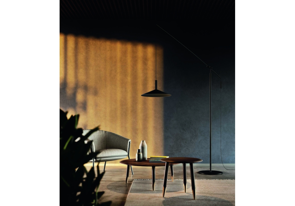 Altura diseñada por Sommella & Anonima Luci para Penta es una lámpara de pie con estructura en acero pintado negro mate. La pantalla es de aluminio pintado de negro y utiliza una fuente de luz LED con sistema dimmer en el cable de alimentación.