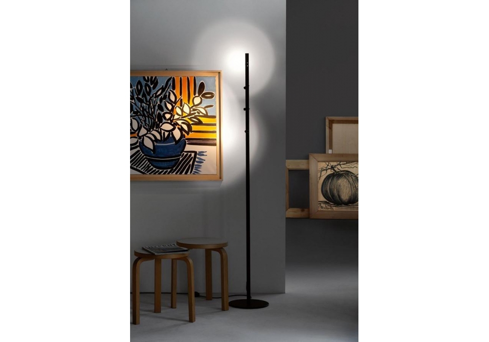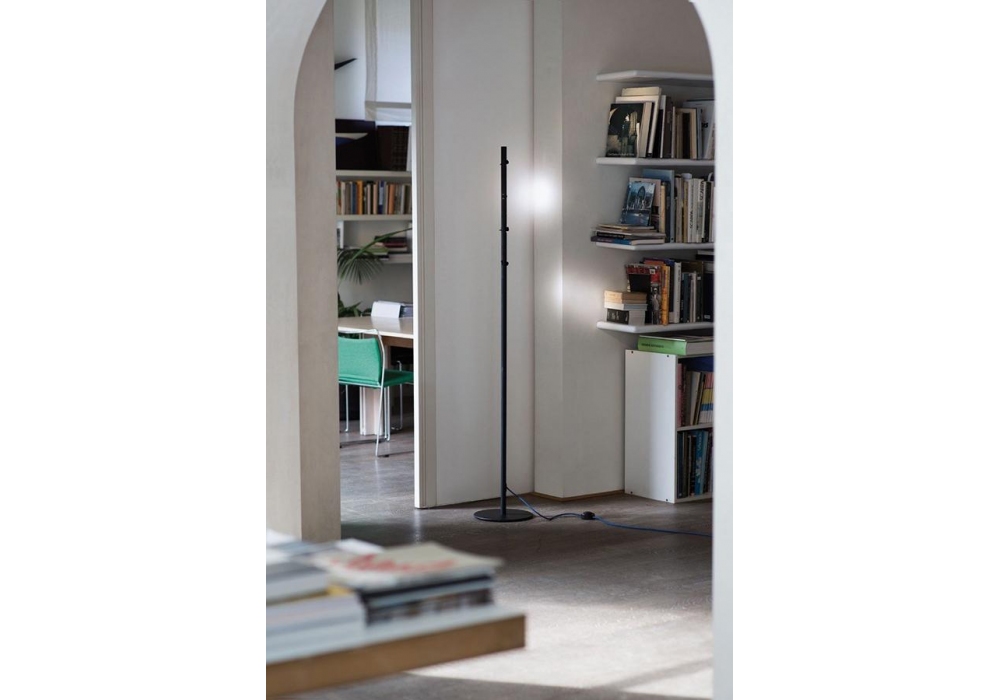 Colibrì 12 diseñada por Emiliana Martinelli para Martinelli Luce es una lámpara de pie con base circular y tija tubular completamente realizada en aluminio anodizado negro. El cuerpo de la lámpara adopta cuatro focos independientes con fuente de luz LED integrada.