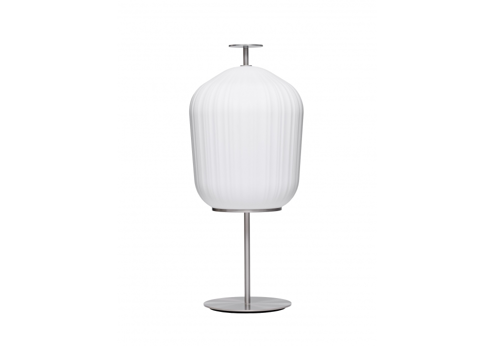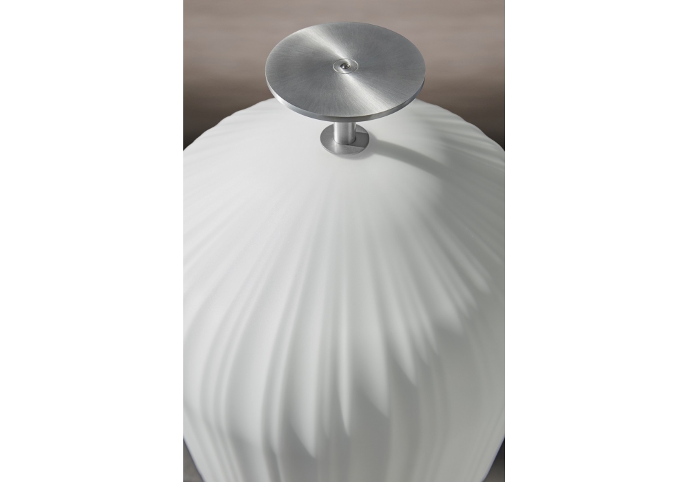 Plissée diseñada por Sebastian Herkner para ClassiCon es una lámpara de pie con estructura de aluminio. Pantalla de vidrio opalino satinado blanco soplado a mano con superficie plisada. Interruptor pulsador integrado en la parte superior de la estructura. Deslizadores de fieltro negro.