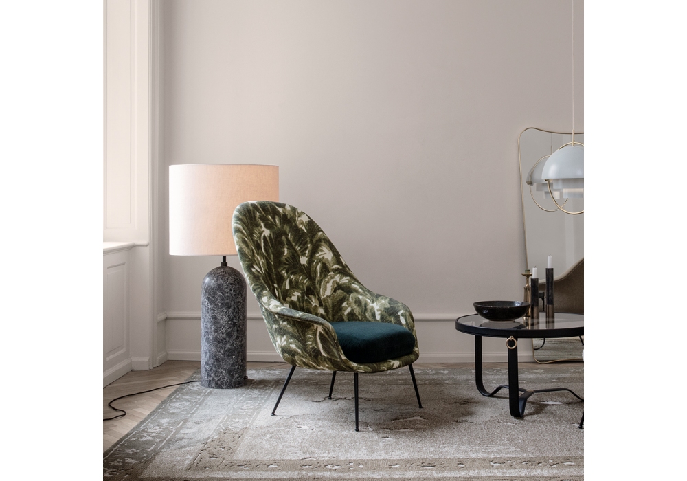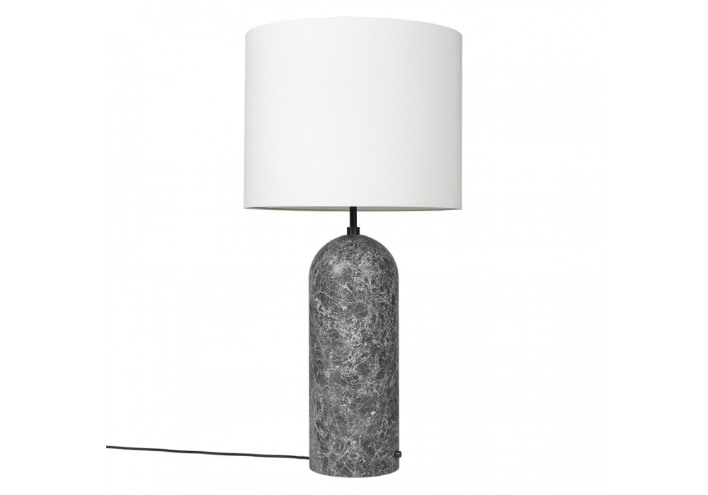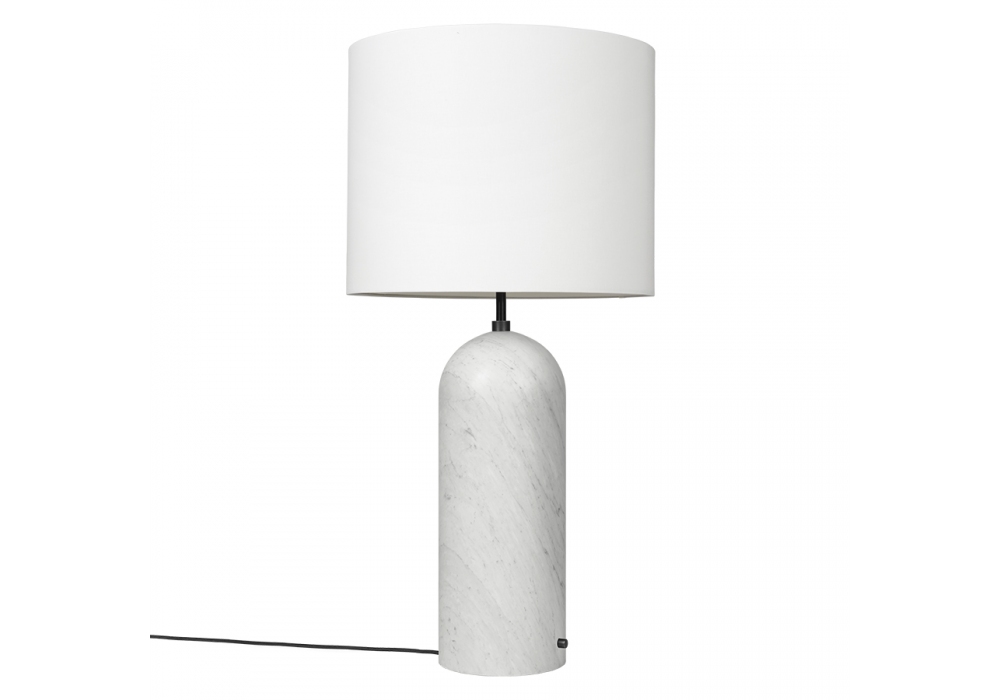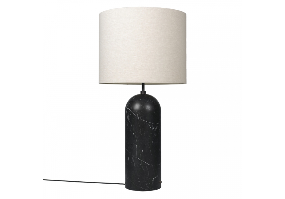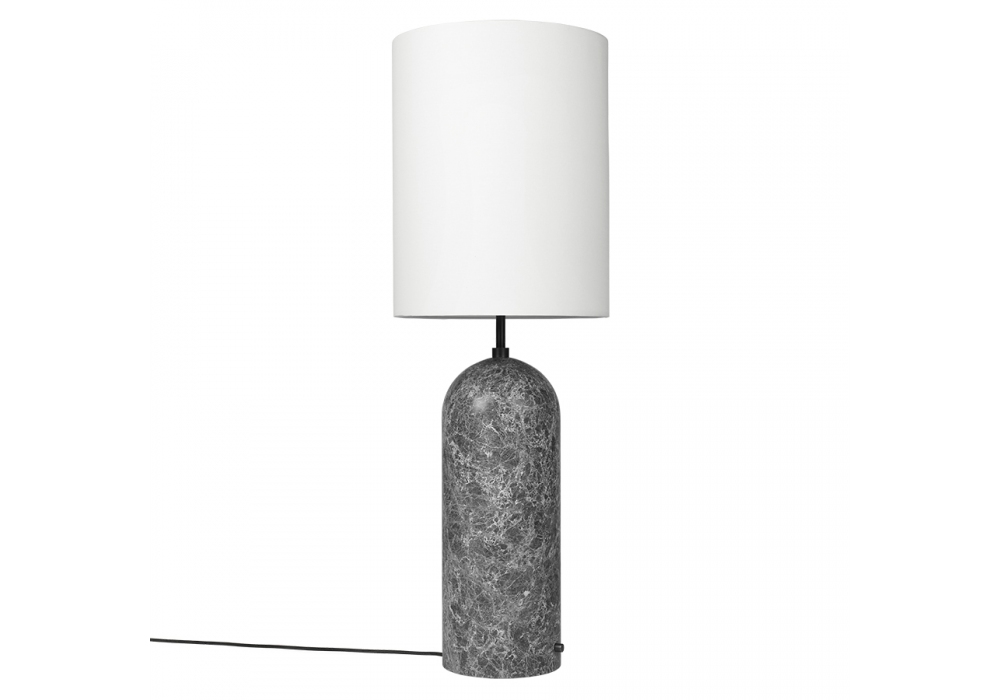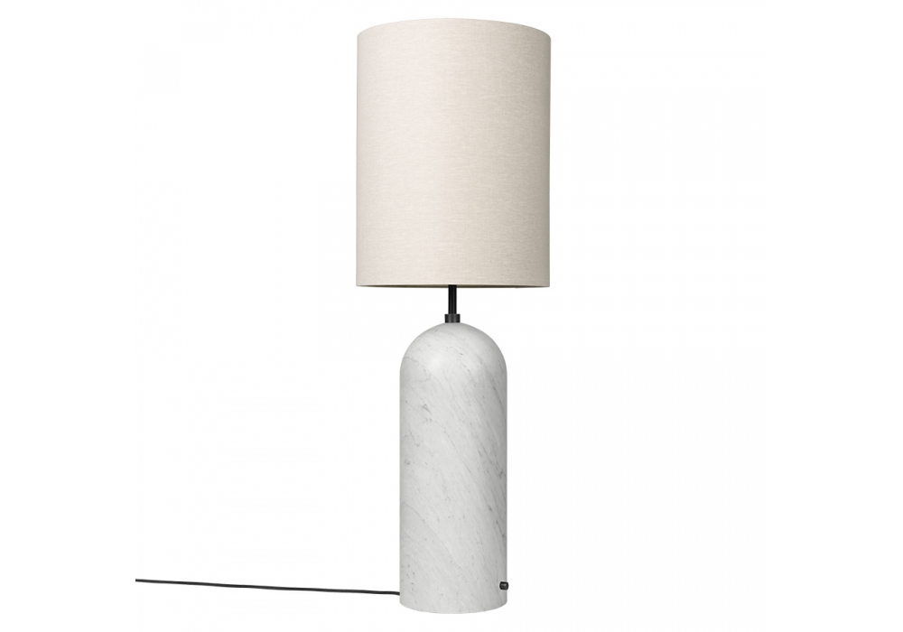 Gravity XL diseñada por Space Copenhagen para Gubi es una lámpara de pie compuesta por base de mármol y pantalla de lona. Está disponible en dos tamaños y en diferentes acabados.