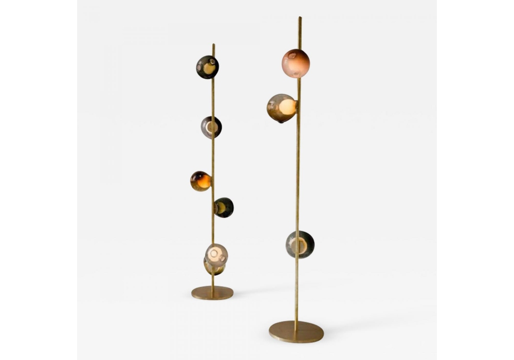 28 Stem diseñada por Omer Arbel para Bocci es una lámpara de pie con estructura tubular y base circular de latón disponible en dos acabados diferentes, latón o negro mate. Los difusores son de vidrio soplado con fuente de luz LED. 28 Stem está disponible en diferentes versiones y tamaños.