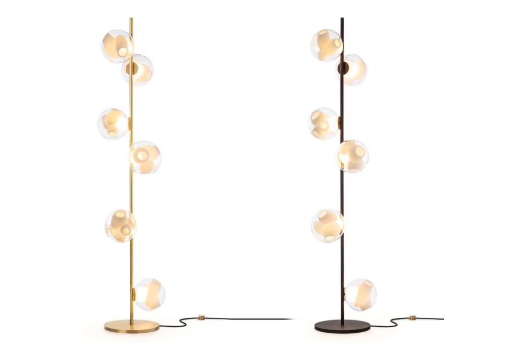 38 Stem diseñada por Omer Arbel para Bocci es una lámpara de pie con estructura tubular y base circular de latón disponible en dos acabados diferentes, latón o negro mate. Los difusores son de vidrio soplado con fuente de luz LED. 38 Stem está disponible en diferentes versiones y tamaños.