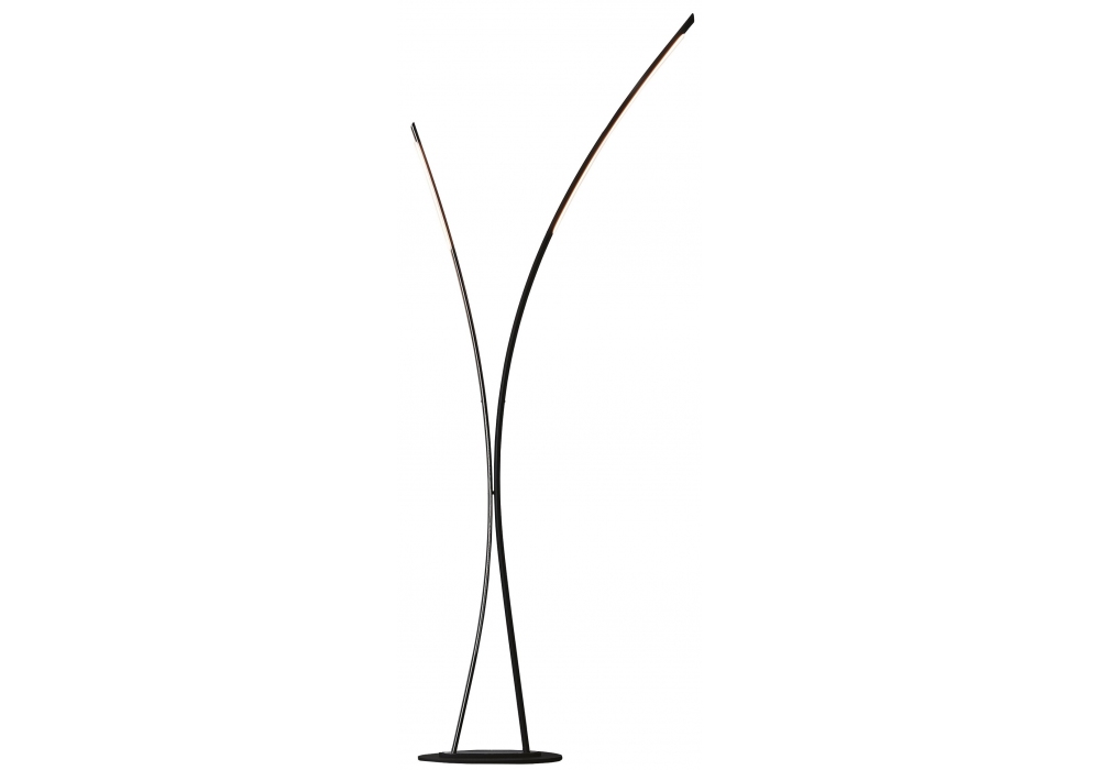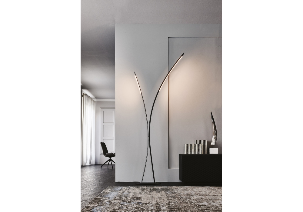 Twin diseñada por STC Studio para Cattelan Italia es una lámpara de pie LED con estructura en acero lacado gofrado grafito y acero cobre o cromo negro.