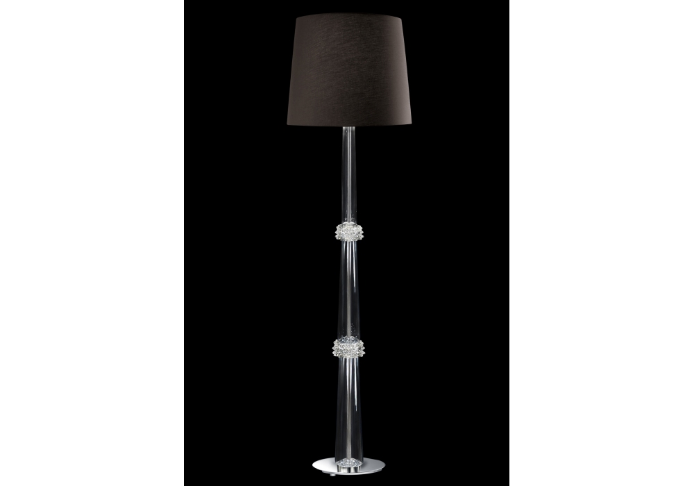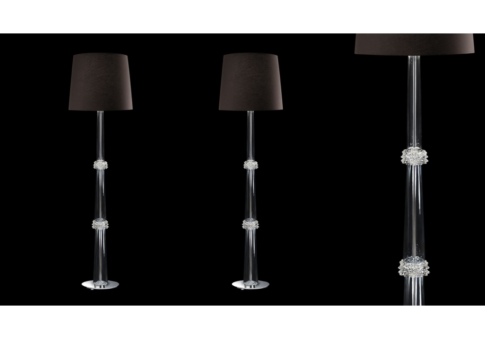 Amsterdam diseñada y producida por Barovier & Toso es una lámpara de pie con estructura portante y base circular en metal. El cuerpo vertical es de cristal veneciano adornado con pulseras de cristal. La pantalla es de tejido circular y protege una fuente de luz LED o halógena regulable. Amsterdam está disponible en diferentes acabados.
