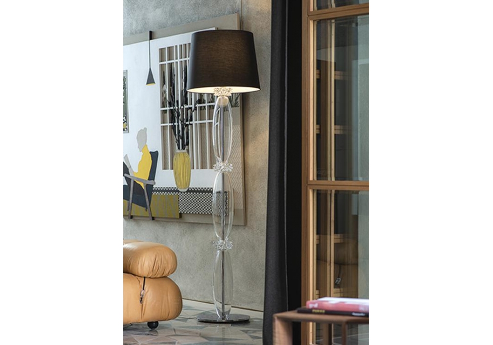 Rotterdam diseñada y producida por Barovier & Toso es una lámpara de pie con base circular en metal cromado brillo, cromo negro o galvanizado dorado. El cuerpo de la lámpara tiene un núcleo de metal tubular cubierto de vidrio veneciano con decoraciones de cristal. La pantalla es de tela y protege una fuente de luz LED o halógena regulable. Rotterdam está disponible en diferentes acabados.