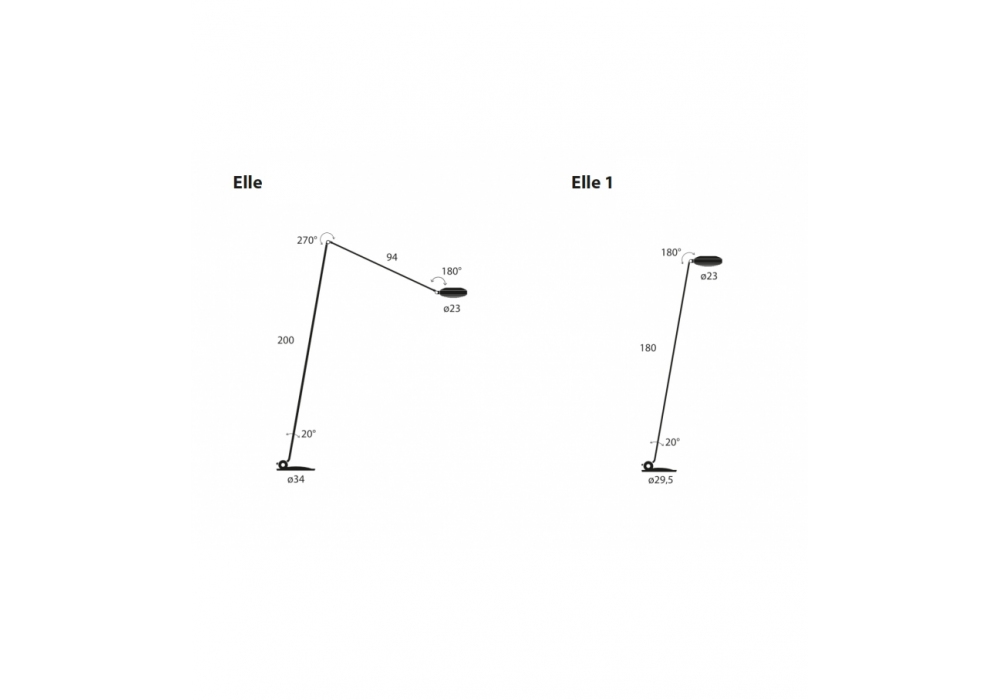 Elle diseñada por Tommaso Cimini para Lumina es una lámpara de pie con estructura en aluminio y acero con brazos móviles y base circular. El difusor es orientable verticalmente en 180° y adopta una fuente de luz halógena. Elle está disponible en diferentes acabados y modelos.