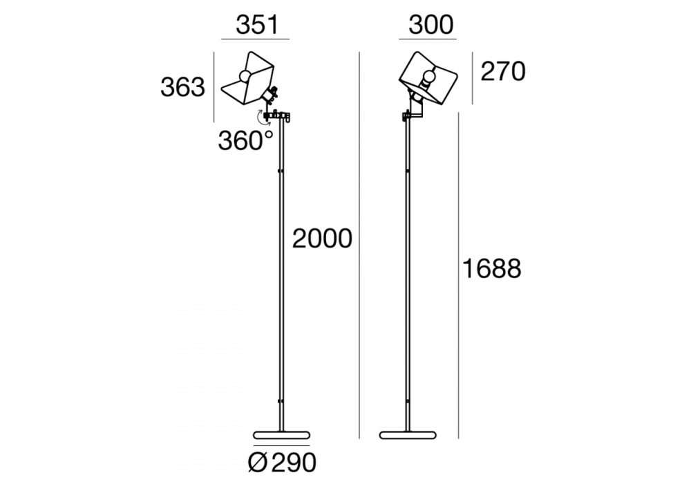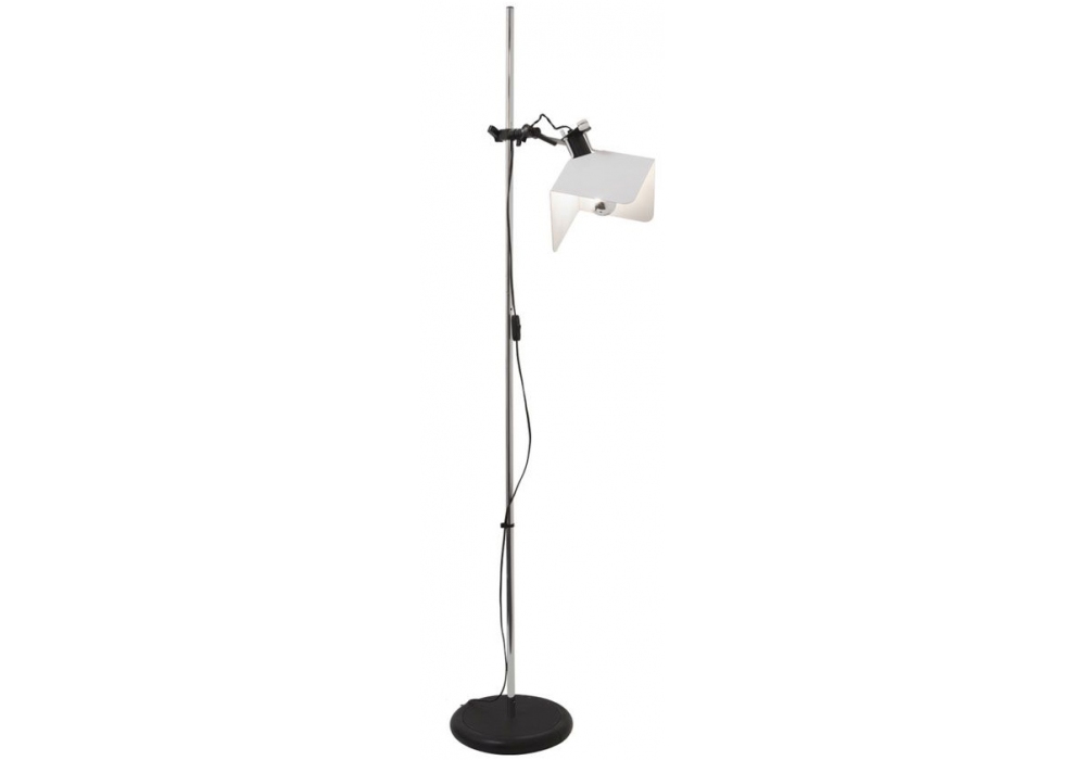 Triedro diseñada por Joe Colombo para Stilnovo es una lámpara de pie LED estructurada por la combinación de metal y material plástico. La base es de forma circular con estructura de acero cromado. El difusor cuadrangular en metal pintado de blanco.