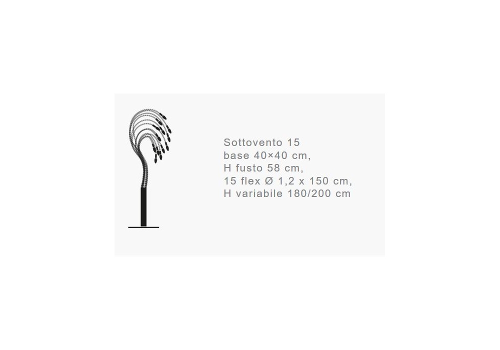 | Dimensiones | base 40 × 40 cm, Vástago Alt. 58 cm, 15 flex Ø 1,2 x 150 cm, Altura variable 180/200 cm |