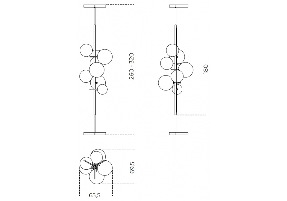 Bolle Verticale diseñada por Massimo Castagna para Gallotti&Radice es una lámpara telescópica de pie a techo con luz LED regulable con 7 esferas de vidrio soplado transparente. Estructura de iluminación de latón bruñido a mano. Parte telescópica en metal oscuro bruñido. Altura regulable de 260 a 320cm con sistema de fijación al techo.