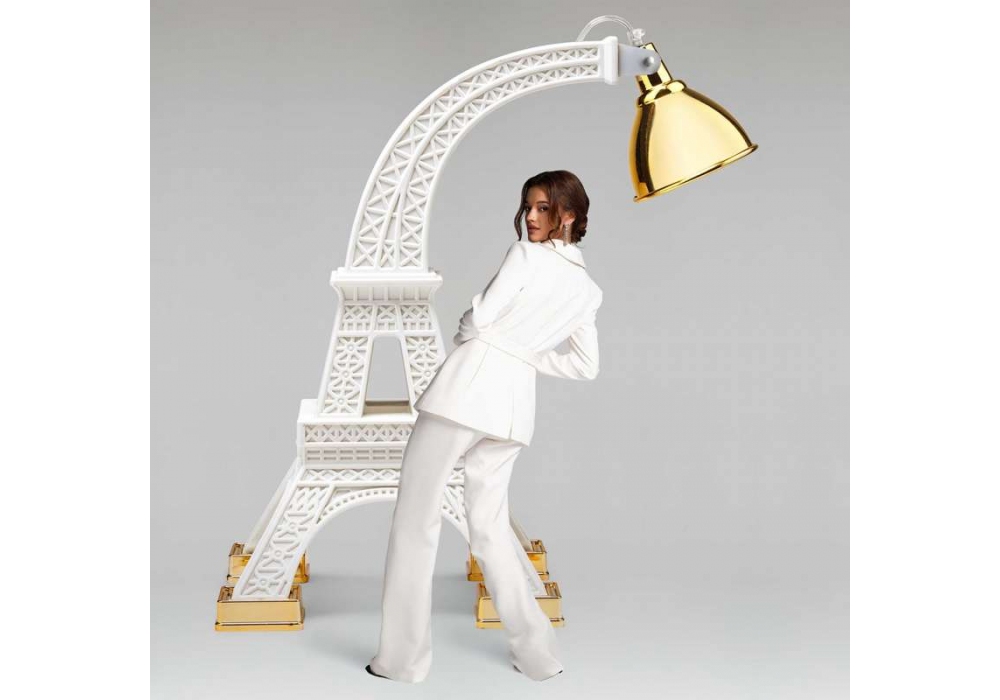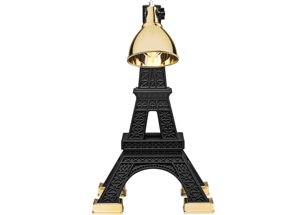 Paris XL diseñada por Studio Job para Qeeboo es una lámpara de mesa en metal y fibra de vidrio pintada en blanco o negro con detalles en latón. El difusor tiene una forma de cúpula de latón ajustable.