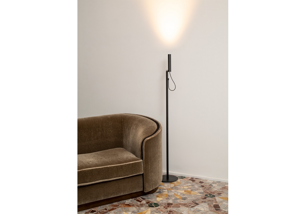Type diseñada por Guillaume Bloget para Nemo es una lámpara de pie con base circular y barra tubular en aluminio pintado negro mate. El difusor tiene una forma cilíndrica que se puede girar 360° y adopta una fuente de luz LED puntual.