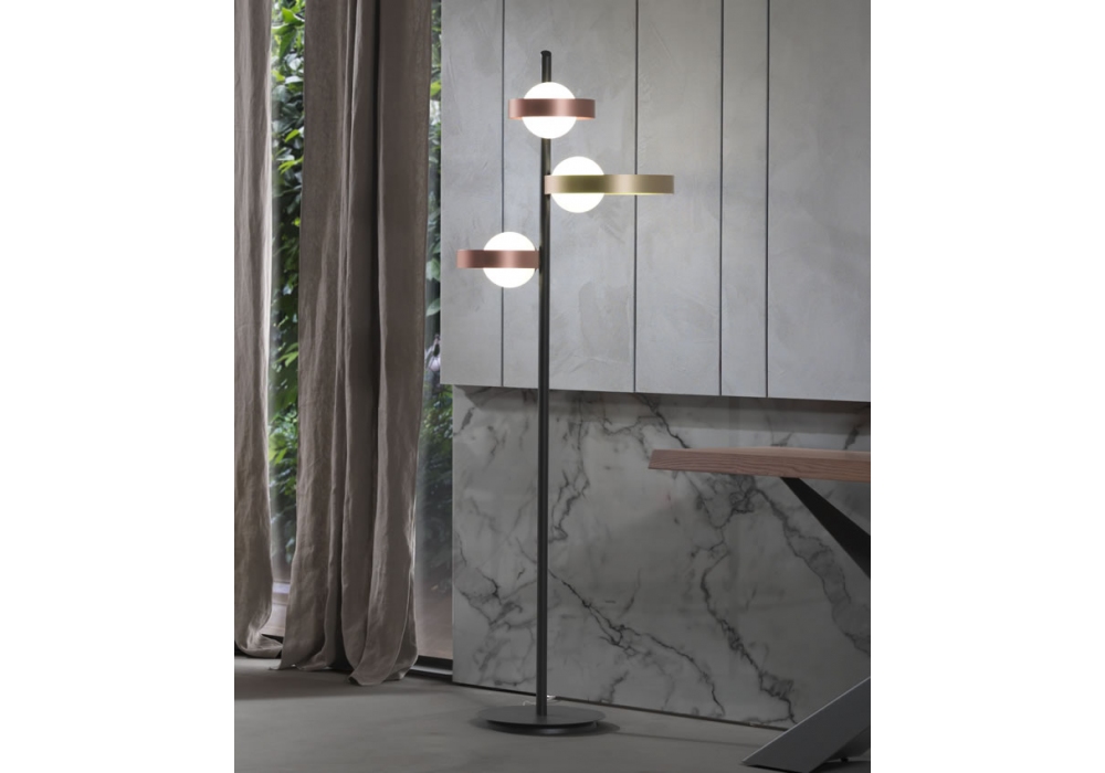 Bubble PT diseñada por Riflessi es una lámpara de pie formada por tres aros de metal pintado (2 oro rosa, 1 oro) en dos dimensiones diferentes. Base con varilla soporte color grafito y cable eléctrico en tejido negro. La peculiaridad de la lámpara es la rotación de los anillos de la posición vertical a la horizontal. La fuente de luz proviene de bombillas de vidrio blanco satinado.