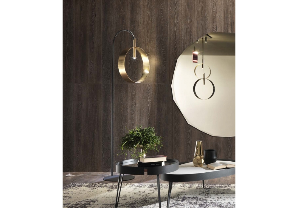 Led Loop PT diseñada por Riflessi es una lámpara de pie compuesta por base y estructura en metal pintado grafito. Anillo de metal pintado con tratamiento satinado galvánico. Cable eléctrico en tejido negro. Disponible en diferentes acabados y dimensiones.