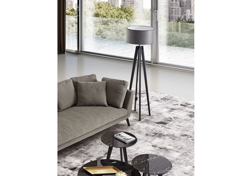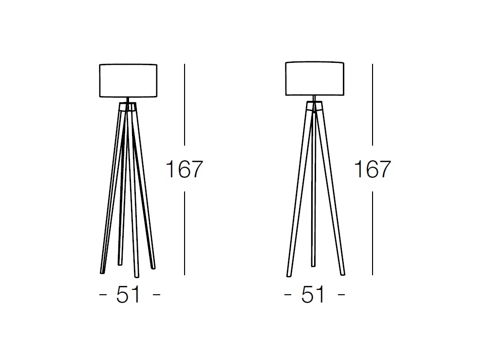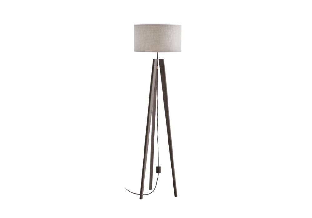 Edgar diseñada por Carlo Bimbi para Dema es una lámpara de pie con pantalla en tejido y pvc. Realizada con estructura de metal lacado en marrón oscuro y patas en fresno teñido en diferentes acabados. Disponible con 3 o 4 patas.