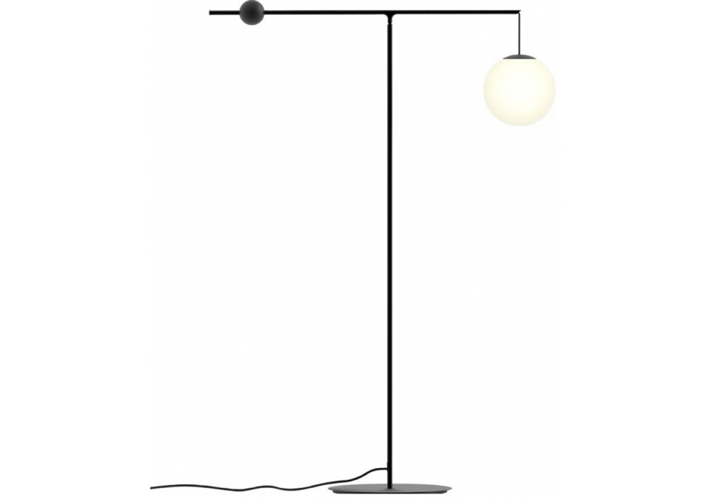 Malamata diseñada por Shulab para Luceplan es una lámpara de pie con estructura en acero negro mate o latón cepillado y difusor en vidrio soplado blanco opal. Al presionar el botón sobre la esfera, el contrapeso puede deslizarse libremente sobre el brazo, lo que le permite cambiar la posición del difusor.