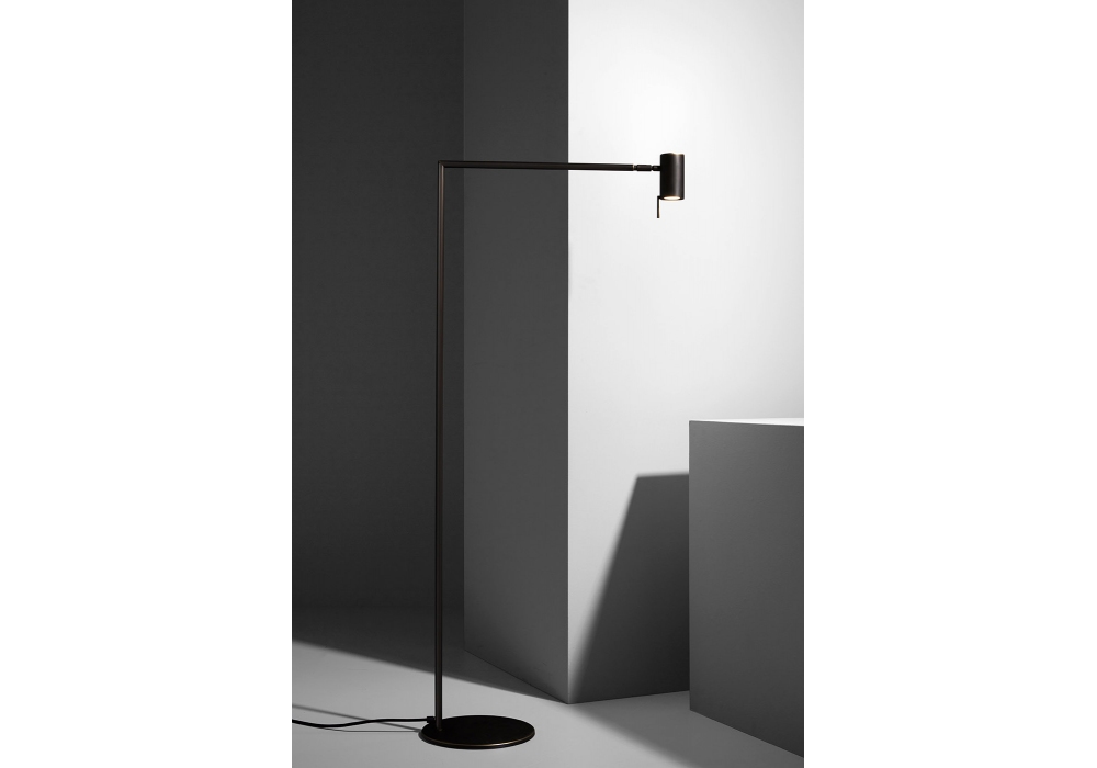 Rectus diseñada por Massimo Tonetto para Venicem es una lámpara de pie con luz direccional, estructura en latón bruñido oscuro y articulación orientable.