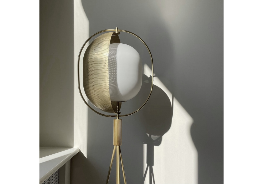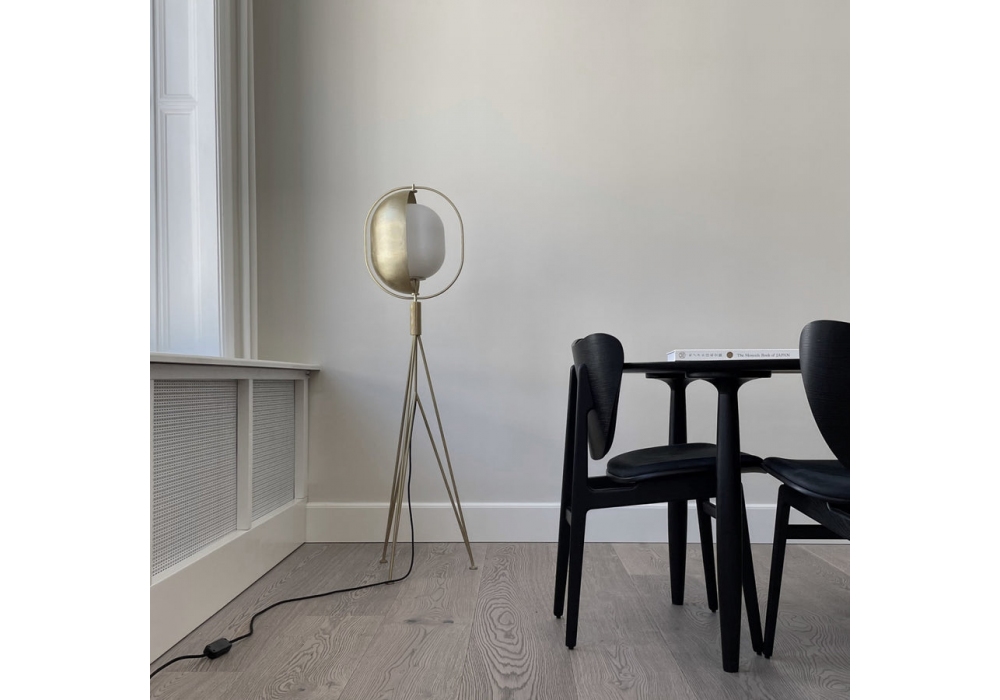 Pearl diseñada por Kristian Sofus Hansen & Tommy Hyldahl para 101 Copenhagen es una lámpara de pie realizada en metal bañado en latón y difusor de cristal opal.