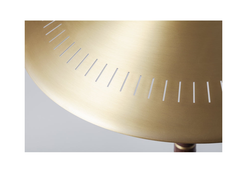 Governor diseñada por Bent Karlby para Lyfa es una lámpara de pie, la pantalla, el pie y la base son todos de latón mate, el mango decorativo es de nogal con incrustaciones de latón.