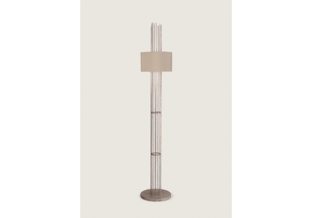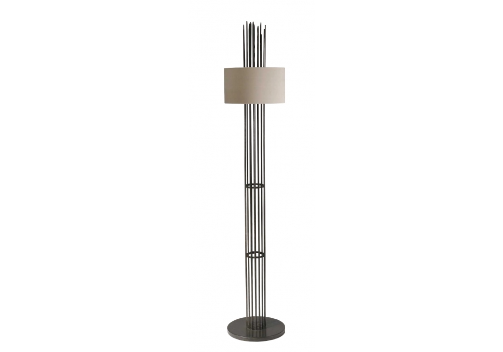 Flynn Caged diseñada y producida por Porta Romana es una lámpara de pie con base circular y estructura portante en acero forjado pintado. La pantalla tiene forma circular en tejido en diferentes acabados y apantalla una fuente de luz con conexión LED tipo G9. Flynn Caged disponible en diferentes acabados de estructura y con pantalla de superficie ondulada o lisa.
