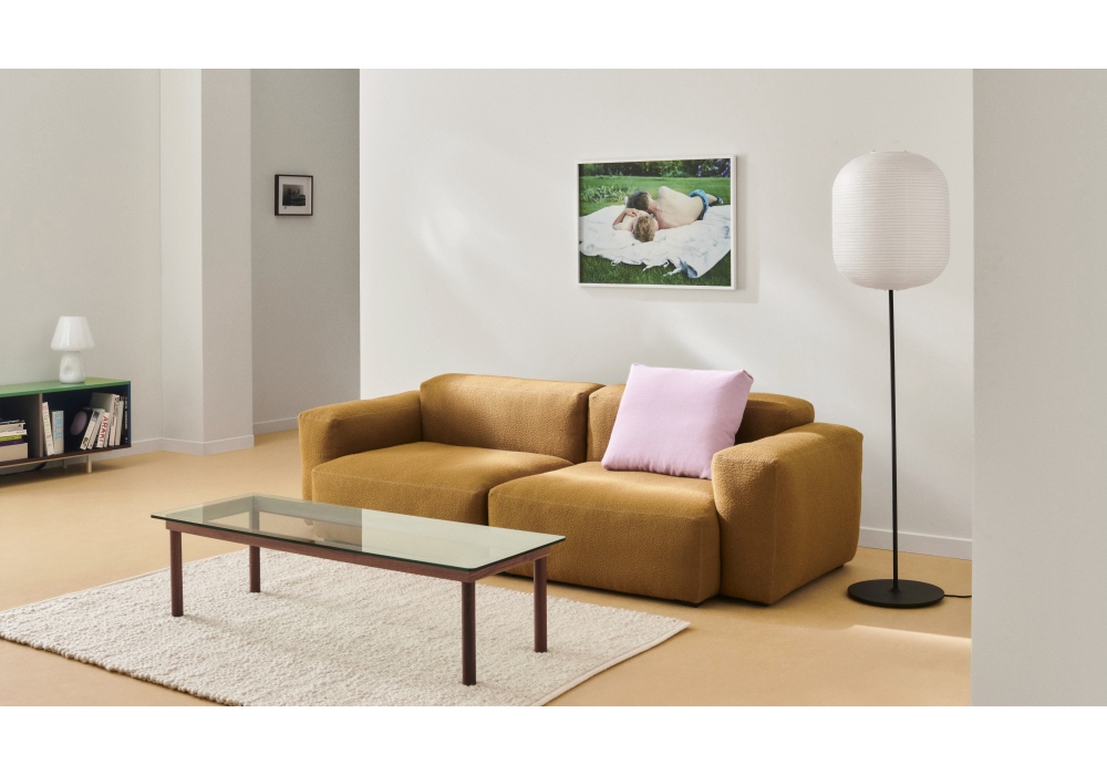 Common producida y diseñada por Hay es una lámpara de pie con estructura y base en acero pintado en polvo o terrazo.