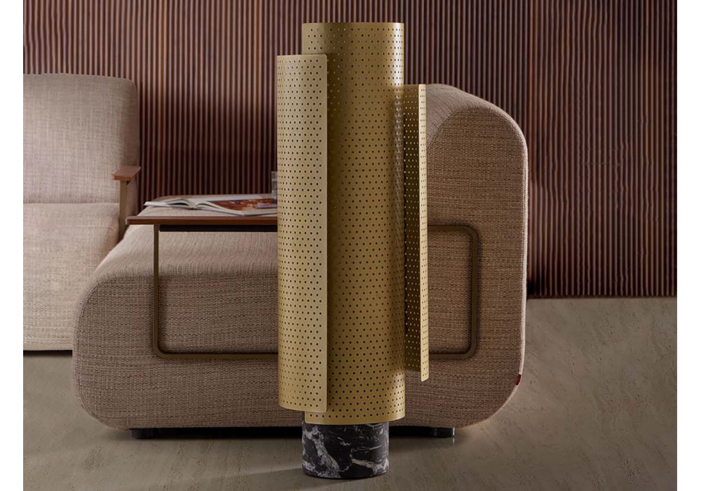 Rio diseñada por Sebastian Herkner para Punt es una lámpara de pie con base en mármol Marquina, pantalla en tejido de algodón natural o aluminio dorado y cable negro con dimmer.