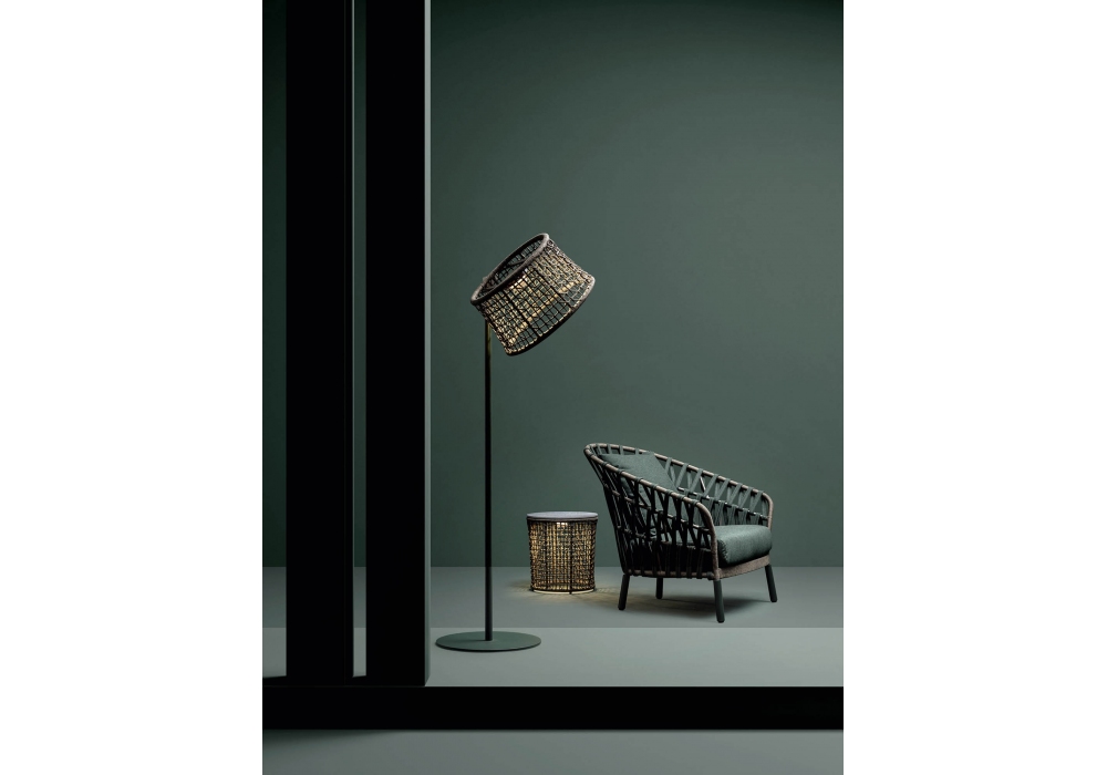 Emma diseñada por Monica Armani para Varaschin es una lámpara de pie con estructura en aluminio con base circular en acero tratado con el ciclo C5M. Cesta de aluminio con recubrimiento de polvo y tejida a mano, equipada con un sistema de ajuste de inclinación de 360°. Iluminación LED. Disponible en diferentes acabados.