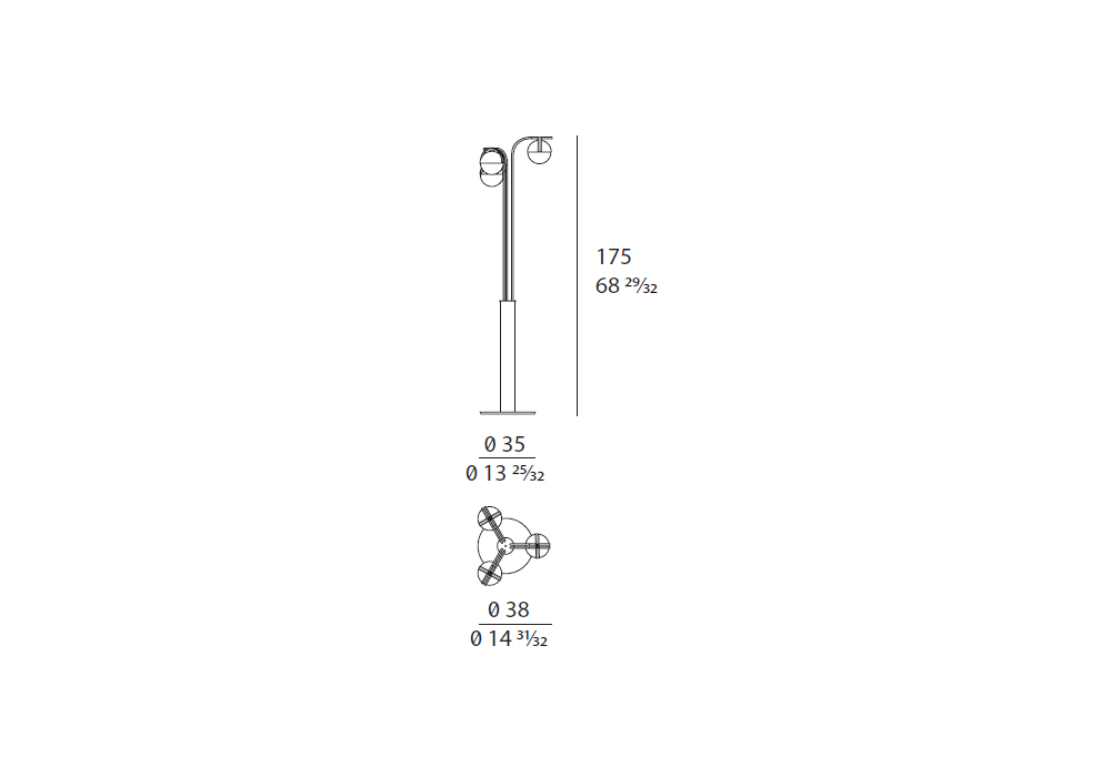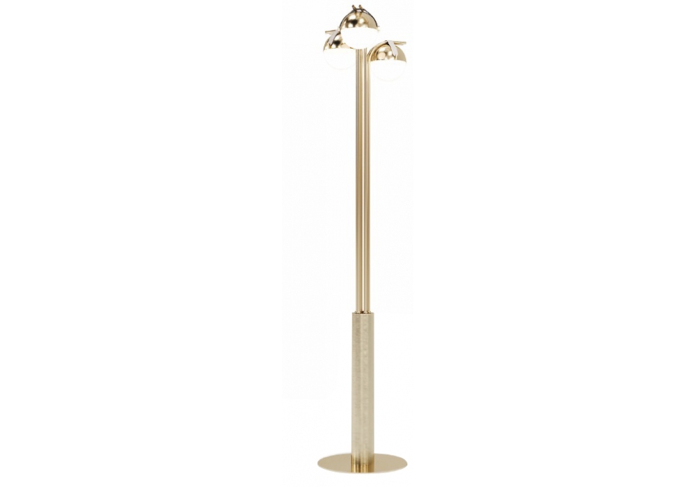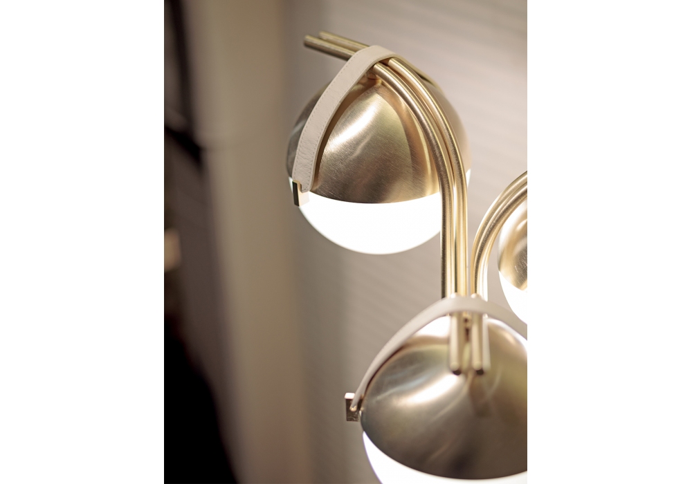 Eclipse diseñada por Andrea Bonini para Turri es una lámpara de pie con estructura en metal acabado oro claro e inserciones en piel. Difusores en cristal blanco opaco.