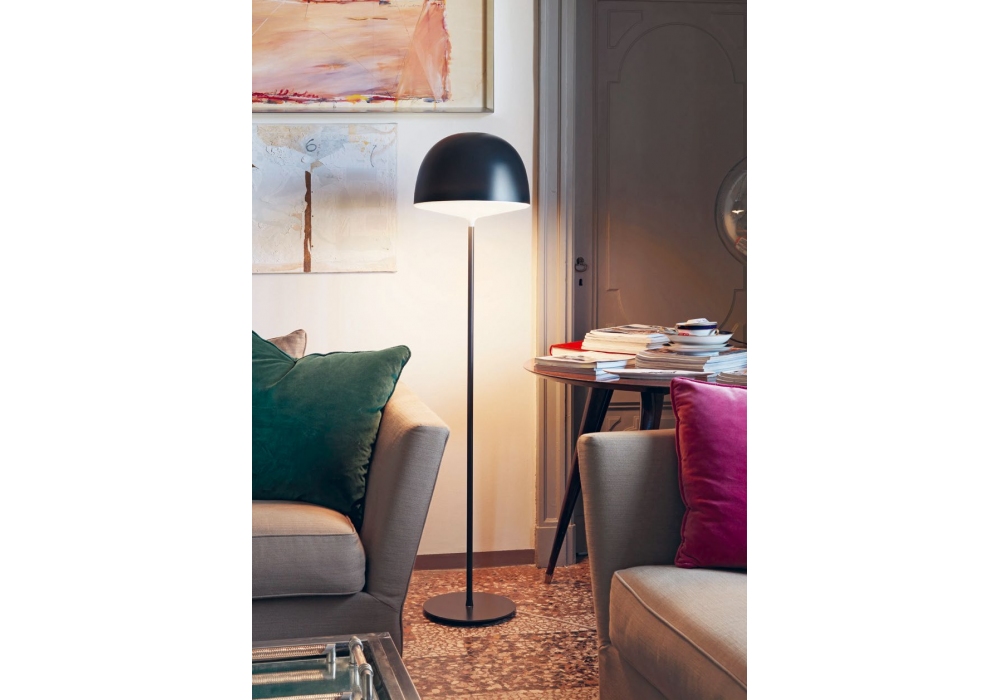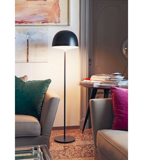 Cheshire diseñada por GamFratesi para Fontana Arte es una lámpara de pie no regulable de luz directa con estructura en metal pintado, difusor superior en policarbonato pintado y difusor inferior en policarbonato opal. Cable transparente, interruptor y enchufe. Disponible en diferentes acabados.