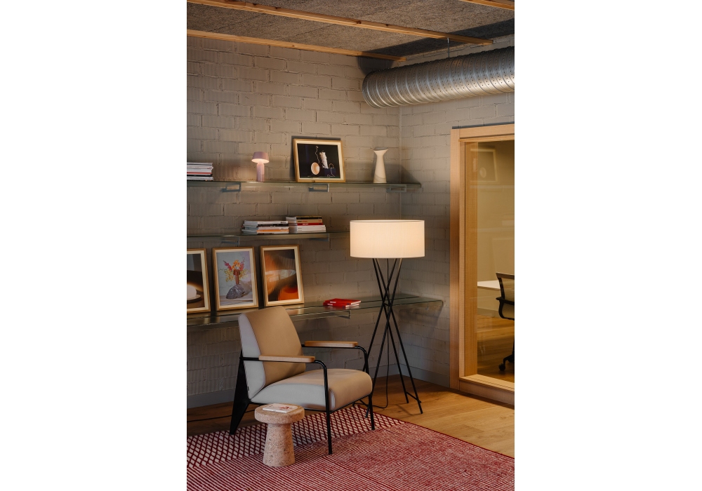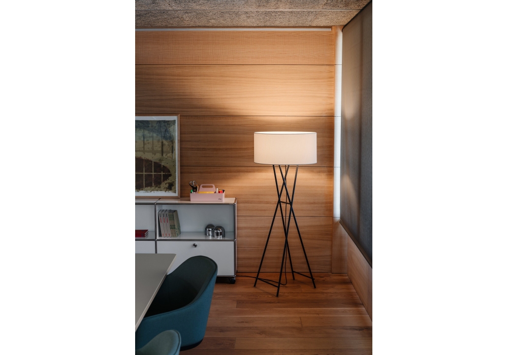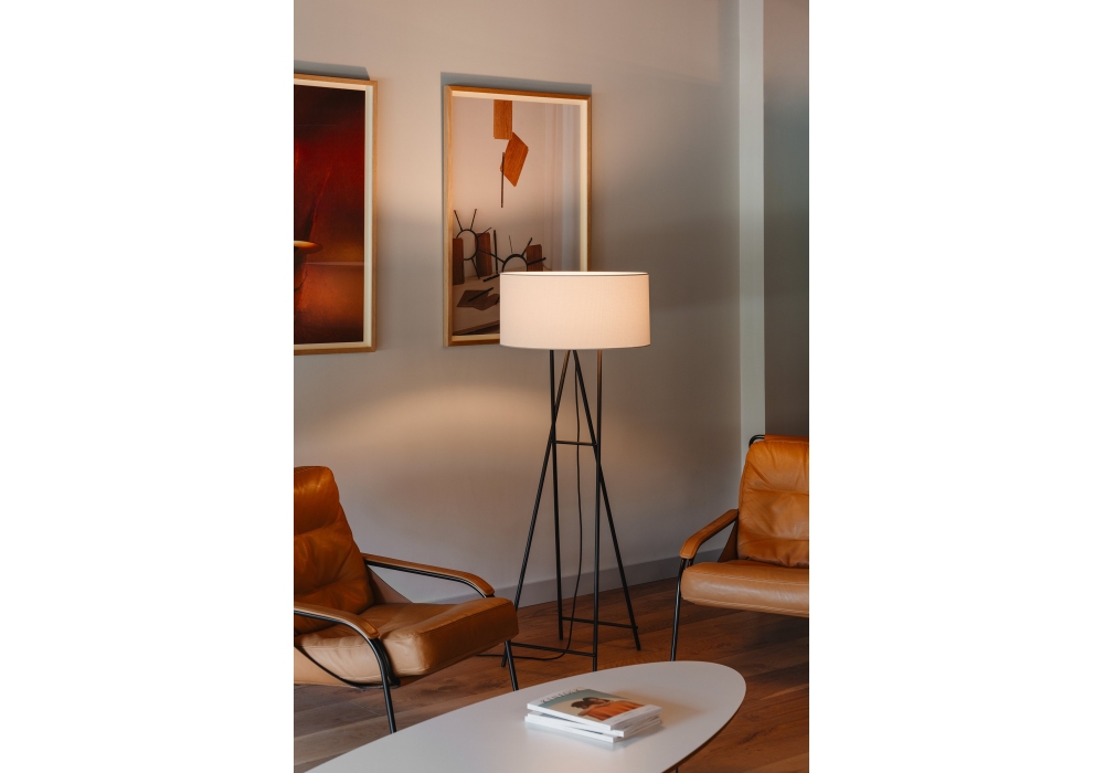 Cala Metal diseñada por Joan Gaspar para Marset es una lámpara de pie realizada en metal pintado de negro y pantalla en poliéster y tejido blanco.