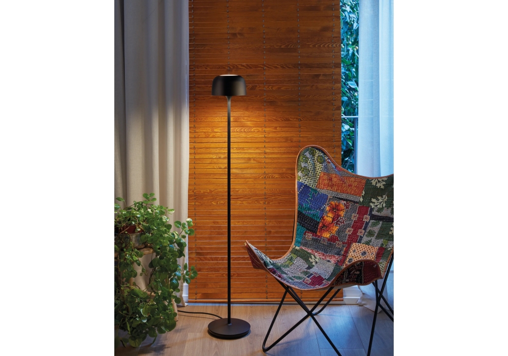 Bol diseñada por Estudi Manel Molina para Bover es una lámpara de pie con base circular y varilla vertical estructurada por la combinación de acero, latón y aluminio. La pantalla tiene forma redondeada y adopta un difusor de policarbonato que apantalla una fuente de luz tipo LED con interruptor de encendido/apagado en el cable de alimentación.